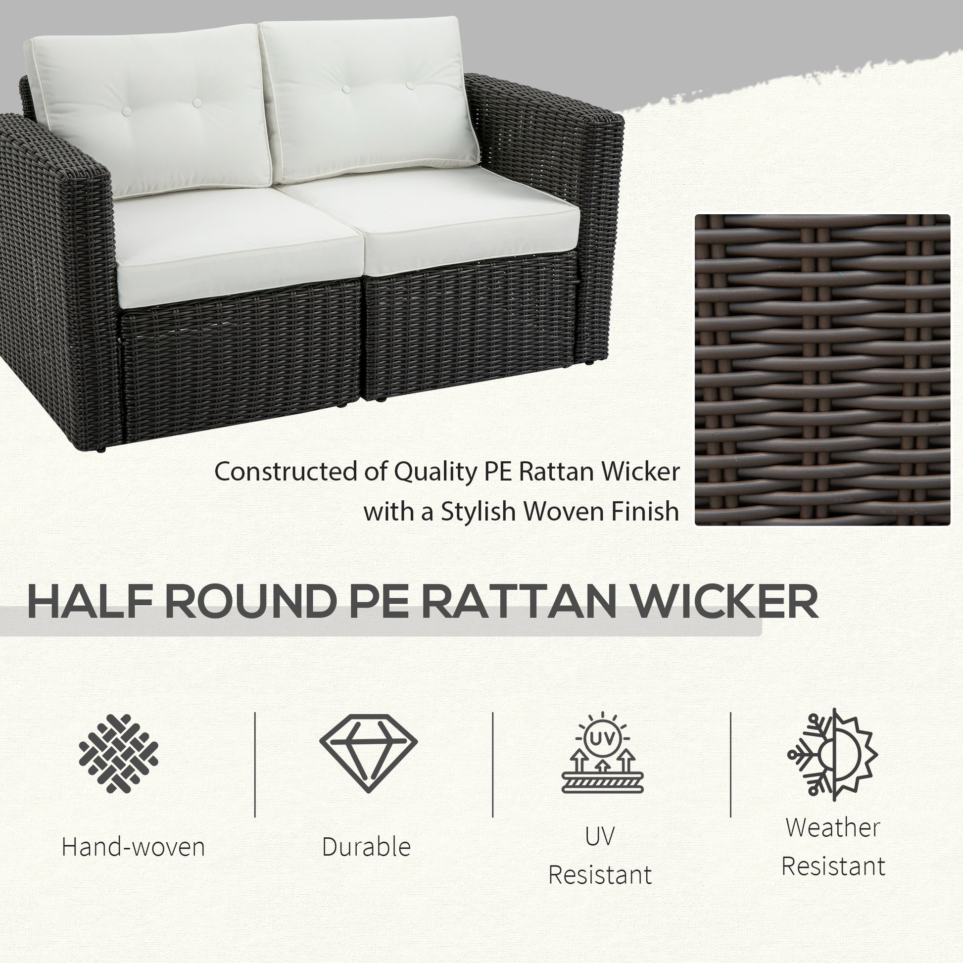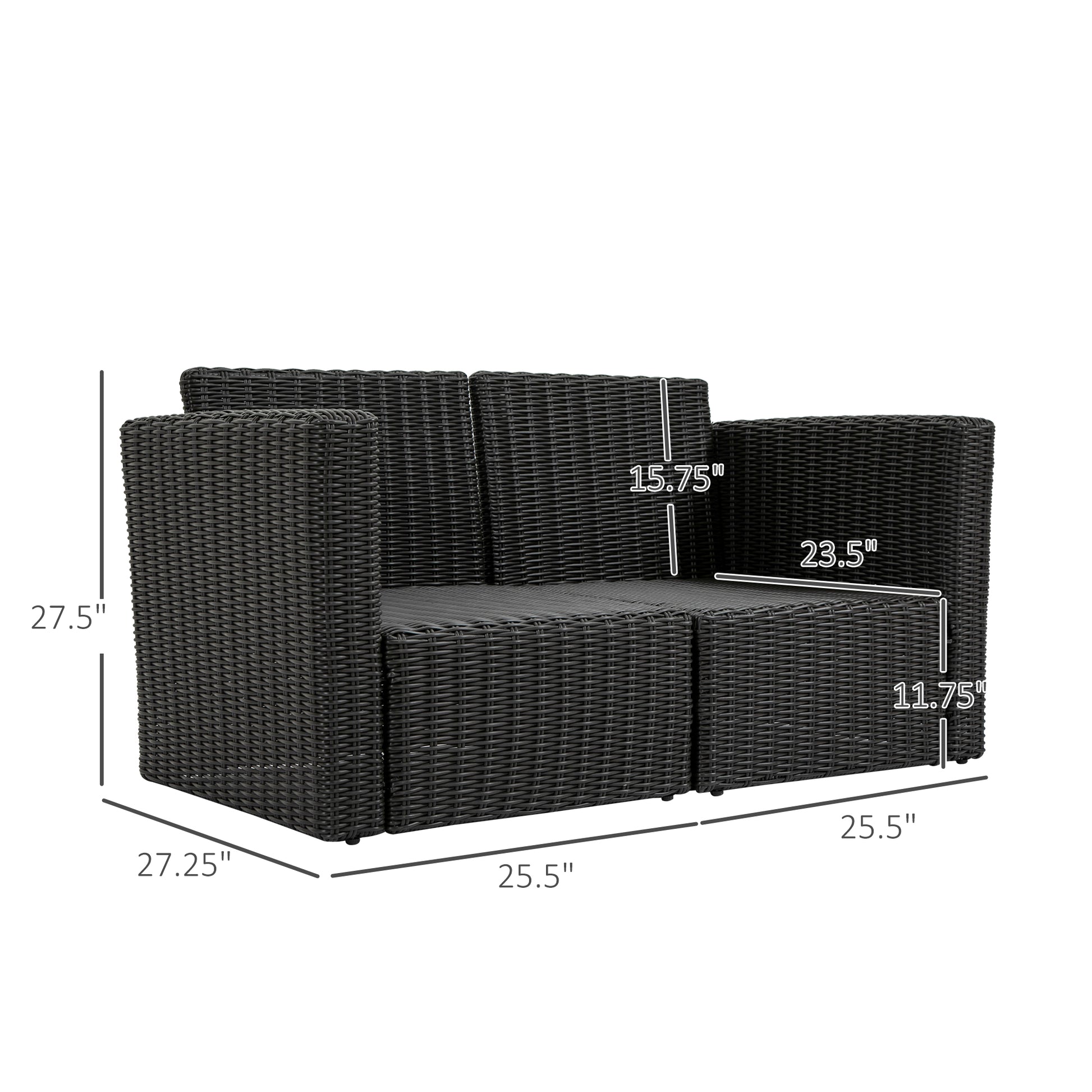 If you have limited backyard space but still want to make a cozy little sitting area? This wicker couch loveseat will bring comfort and charm to your yard space. Put it next to a fire pit and enjoy some relaxation time in nature. You can remove the clips, create two single-person chairs, catch up with a friend, and have a cool drink on a hot summer day. Bring comfort and style to your outdoor spaces with this rattan sofa from Outsunny. Features: - 2 piece corner sofa set can be used as a corner sofa or a double sofa two plastic clips make the sofa tighter - Made of rust-resistant steel frame with durable, weather-resistant half round PE rattan wicker - Curved armrests with thick, 4" thick padded seat and soft back cushions for comfort - The seat cushion covers have a zipper for easy removal and are washable (back cushion covers cannot be removed) - Assembly required Specification: - Color: Dark Coffee Rattan, Beige Cushion - Material: Steel, PE rattan, Polyester - Combined Size: 51" W x 27.25" D x 27.5" H - Left Corner Sofa Dimensions: 25.5" W x 27.25" D x 27.5" H - Right Corner Sofa Dimensions: 25.5" W x 27.25" D x 27.5" H - Combined Seat Dimensions: 44" W x 23.5" D - Single Seat Dimensions: 22" W x 23.5" D - Weight Capacity: 352 lbs. - Item Label: 860-204CW Package Includes: - 2 x Rattan Corner Sofa - 2 x Seat Cushion - 2 x Back Cushion - 2 x Plastic Clips - 1 x Manual If you have limited backyard space but still want to make a cozy little sitting area? Features: - 2 piece corner sofa set can be used as a corner sofa or a double sofa two plastic clips make the sofa tighter - Made of rust-resistant steel frame with durable, weather-resistant half round PE rattan wicker - Curved armrests with thick, 4" thick padded seat and soft back cushions for comfort - The seat cushion covers have a zipper for easy removal and are washable (back cushion covers cannot be removed) - Assembly required Specification: - Color: Mixed Gray Rattan, Gray Cushion - Material: Steel, PE rattan, Polyester - Combined Size: 51" W x 27.25" D x 27.5" H - Left Corner Sofa Dimensions: 25.5" W x 27.25" D x 27.5" H - Right Corner Sofa Dimensions: 25.5" W x 27.25" D x 27.5" H - Combined Seat Dimensions: 44" W x 23.5" D - Single Seat Dimensions: 22" W x 23.5" D - Weight Capacity: 352 lbs. - Item Label: 860-204GY Package Includes: - 2 x Rattan Corner Sofa - 2 x Seat Cushion - 2 x Back Cushion - 2 x Plastic Clips - 1 x Manual If you have limited backyard space but still want to make a cozy little sitting area? Features: - 2 piece corner sofa set can be used as a corner sofa or a double sofa two plastic clips make the sofa tighter - Made of rust-resistant steel frame with durable, weather-resistant half round PE rattan wicker - Curved armrests with thick, 4" thick padded seat and soft back cushions for comfort - The seat cushion covers have a zipper for easy removal and are washable (back cushion covers cannot be removed) - Assembly required Specification: - Color: Dark Coffee Rattan, Dark Blue Cushion - Material: Steel, PE rattan, Polyester - Combined Size: 51" W x 27.25" D x 27.5" H - Left Corner Sofa Dimensions: 25.5" W x 27.25" D x 27.5" H - Right Corner Sofa Dimensions: 25.5" W x 27.25" D x 27.5" H - Combined Seat Dimensions: 44" W x 23.5" D - Single Seat Dimensions: 22" W x 23.5" D - Weight Capacity: 352 lbs. - Item Label: 860-204DB Package Includes: - 2 x Rattan Corner Sofa - 2 x Seat Cushion - 2 x Back Cushion - 2 x Plastic Clips - 1 x Manual Bring the comforts of the inside outdoors with Outsunny. Outsunny has an outdoor loveseat sofa so you can sit with a friend in the soft summer sun. Place it on your porch, patio, yard, or garden; it offers cushioned comfort, and throw pillows so you can enjoy the outdoors a little more. It was handwoven with PE rattan, a material with all the tropical style of wicker, but all-weather with superior resistance to water and weather. Get out, get comfortable, get Outsunny. Features: - Outdoor-ready loveseat sofa seats two adults - Double-string half-round PE Rattan with a hand-woven pattern, great for all-weather use - Treated steel frame to help support 528 lbs. - Wide, cushioned sitting space with two throw pillows - Adjustable anti-slip foot pads to help it stay stable and prevent surfaces from being scratched - Zippered cushion cover makes it easy to spot clean - It only takes roughly half an hour for a single person to assemble Specification: - Color: Brown Rattan, Beige Cushion - Materials: Steel, PE Rattan, Polyester, Foam - Overall Dimensions: 55" W x 28.25" D x 29.5" H - Seat Size: 47.25" W x 26.25" D - Seat to Floor Height: 12.5" H - Weight Capacity: 528 lbs. - Item Label:860-302V00BN Package Includes: - 1 x Loveseat Sofa Chair - 1 x Seat Cushion - 1 x Back Cushion - 2 x Throw Pillow - 1 x Manual Bring the comforts of the inside outdoors with Outsunny. Features: - Outdoor-ready loveseat sofa seats two adults - Double-string half-round PE Rattan with a hand-woven pattern, ideal for all-weather use - Treated steel frame to help support 528 lbs. - Wide, cushioned sitting space with two throw pillows - Adjustable anti-slip foot pads to help it stay stable and prevent surfaces from being scratched - Zippered cushion cover makes it easy to spot clean - It only takes roughly half an hour for a single person to assemble Specification: - Color: Brown Rattan, Dark Blue Cushion - Materials: Steel, PE Rattan, Polyester, Foam - Overall Dimensions: 55" W x 28.25" D x 29.5" H - Seat Size: 47.25" W x 26.25" D - Seat to Floor Height: 12.5" H - Weight Capacity: 528 lbs. - Item Label:860-302V00DB Package Includes: - 1 x Loveseat Sofa Chair - 1 x Seat Cushion - 1 x Back Cushion - 2 x Throw Pillow - 1 x Manual.