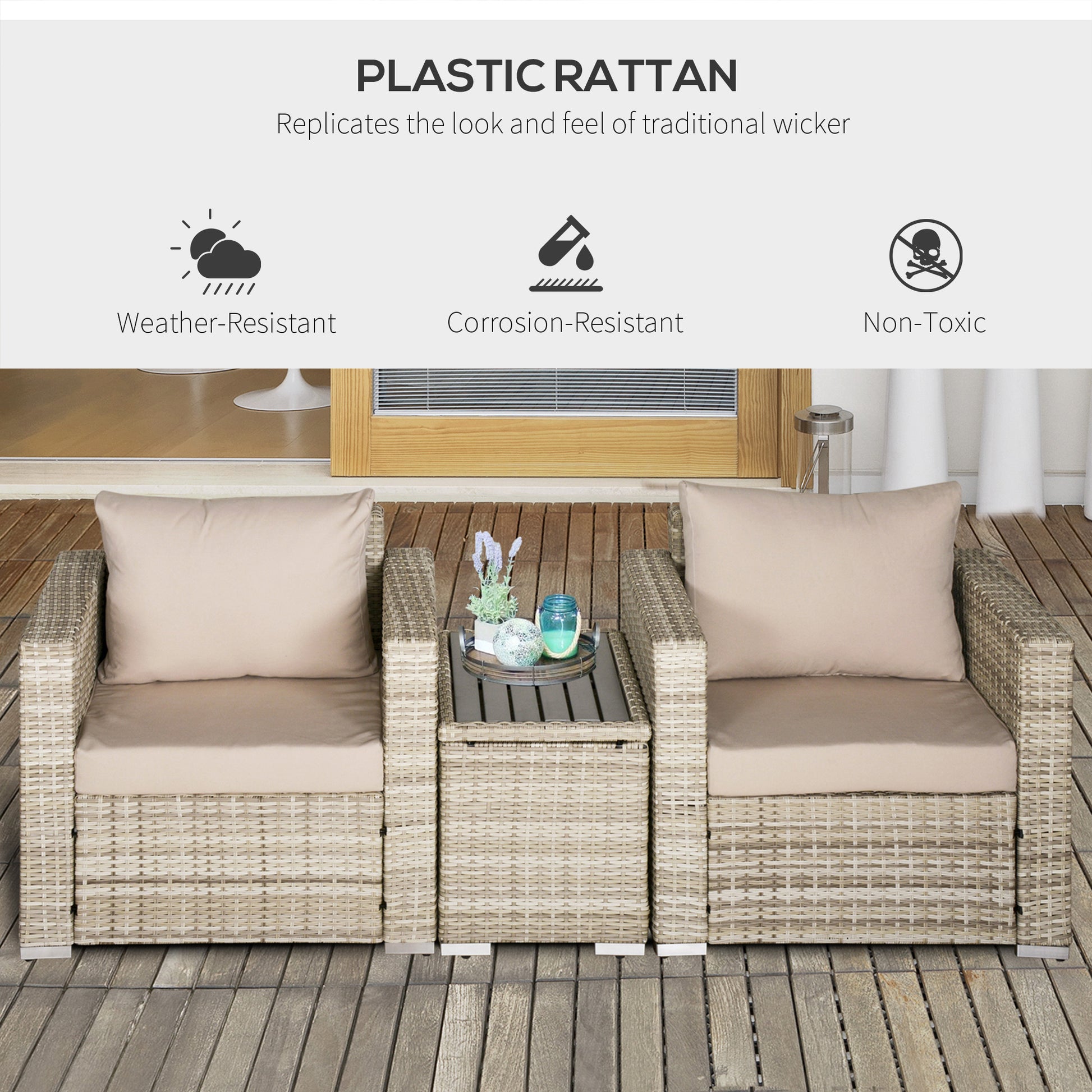 It's easy to find reasons to go outside when there's a comfy chair waiting. Outsunny has a balcony furniture set to bring comfort to the outside of your apartment. Each chair has a plush cushion on the seat and back. To the side, a patio coffee table gives you room to share snacks, drinks, or put down reading material. Speaking of material, our balcony furniture set was handwoven with water-safe PE rattan, and the table is made of composite, offering a wood look that won't saturate. Features: - This small balcony furniture set includes two patio chairs and a wood-like composite coffee table - Water-safe PE wicker with a reinforcing steel frame - Comfy cushions that remove for cleaning - Assembly required Specification: - Color: Gray, Cream White - Materials: Steel, PE Rattan, Polyester, Foam - Single Sofa Dimensions: 31.5" W x 29.5" D x 28.75" H - Coffee Table Dimensions: 15.75" W x 27.5" D x 18.5" H - Single Seat Dimension: 22.75" W x 25.5" D - Seat Height (Without Cushion): 12.5" H - Max Load: 350 lbs. (Single Sofa), 65 lbs. (Coffee Table) Package Includes: - 2 x Patio Chair - 1 x Outdoor Coffee Table - 2 x Seat Cushion - 2 x Back Cushion - 1 Manual.