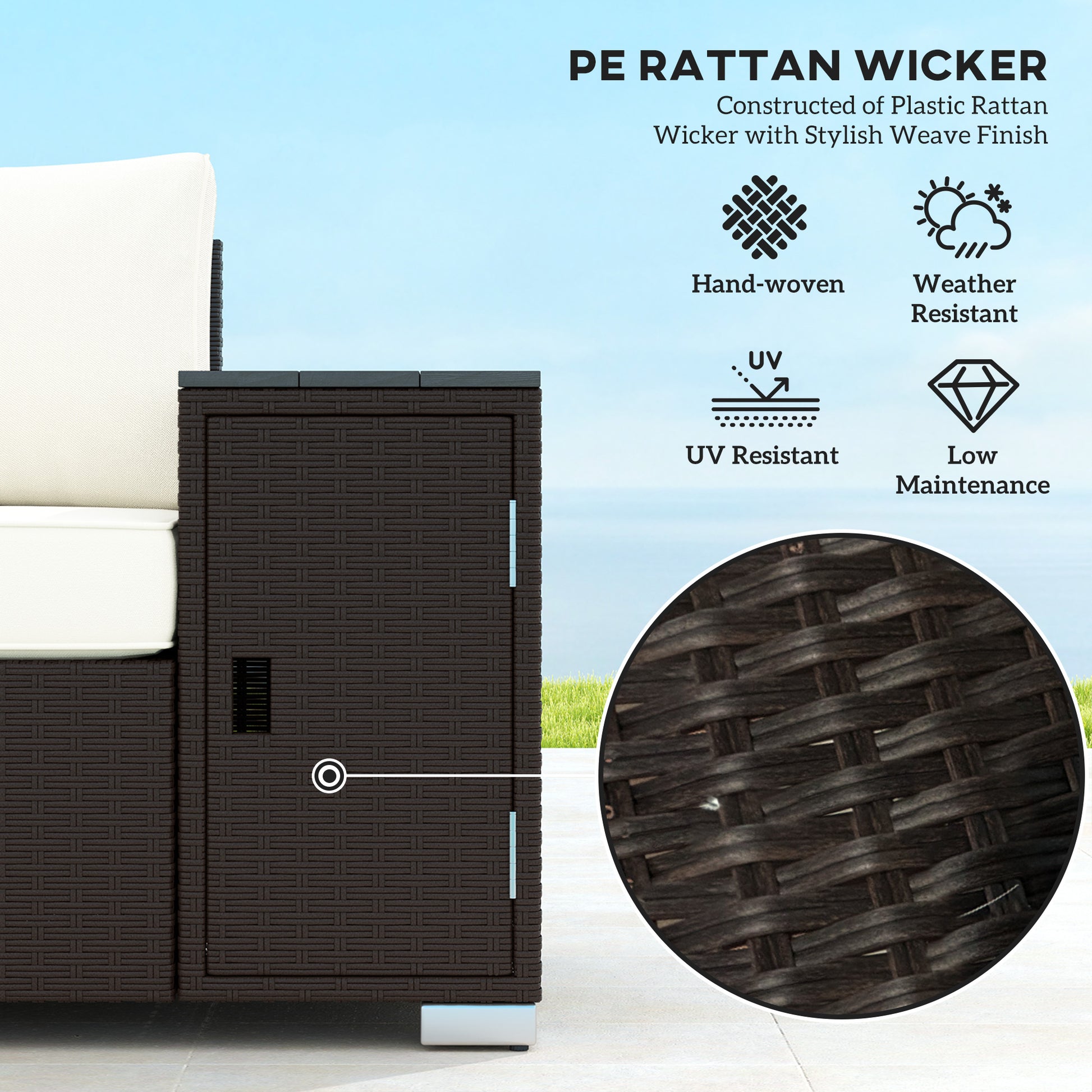 Upgrade your outdoor space with the Outsunny three-seater wicker patio couch. Enjoy a spacious rattan sofa with thick seats and back cushions that offer superior comfort. Additionally, the wide armrests can double as small side tables with convenient storage space underneath. The steel frame wrapped in UV-resistant PE rattan protects this balcony couch from the elements, while the splash-resistant, zippered cushion covers make cleaning up a breeze. Get out, get comfy, and get Outsunny!. Features: - Outdoor couch with wide and deep seats to seat three people comfortably - Wide armrests double as side tables for drinks or books - Hidden storage under armrests keeps small items out-of-the-way when not in use - Thickened seat and back cushions for comfort - Zippered cushion covers allow for easy cleaning and maintenance - Steel frame with plastic wicker to withstand outdoor elements - Adjustable foot pads keep sofa balanced on uneven surfaces - Easy assembly required Specification: - Color: Brown, Cream White - Material: Steel, PE Wicker, Polyester, Wood-plastic Composite - Overall Dimension: 97.2" W x 27.6" D x 28.3" H - Seat Size: 73.2" W x 24.4" D - Seat Height: 13" - Back Size: 15.4" L/15" H - Armrest Size: 12.6" W x 27.6" D x 22.4" H - Cushion Thickness: (seat) 3.9", (back) 7.1" - Weight Capacity: 794 lbs. - Item Label: 860-385V00CW Package Includes: - 1 x Outdoor Rattan Sofa - 1 x Manual Upgrade your outdoor space with the Outsunny three-seater wicker patio couch. Features: - Outdoor couch with wide and deep seats to seat three people comfortably - Wide armrests double as side tables for drinks or books - Hidden storage under armrests keeps small items out-of-the-way when not in use - Thickened seat and back cushions for comfort - Zippered cushion covers allow for easy cleaning and maintenance - Steel frame with plastic wicker to withstand outdoor elements - Adjustable foot pads keep sofa balanced on uneven surfaces - Easy assembly required Specification: - Color: Gray - Material: Steel, PE Wicker, Polyester, Wood-plastic Composite - Overall Dimension: 97.2" W x 27.6" D x 28.3" H - Seat Size: 73.2" W x 24.4" D - Seat Height: 13" - Back Size: 15.4" L/15" H - Armrest Size: 12.6" W x 27.6" D x 22.4" H - Cushion Thickness: (seat) 3.9", (back) 7.1" - Weight Capacity: 794 lbs. - Item Label: 860-385V01GY Package Includes: - 1 x Outdoor Rattan Sofa - 1 x Manual.