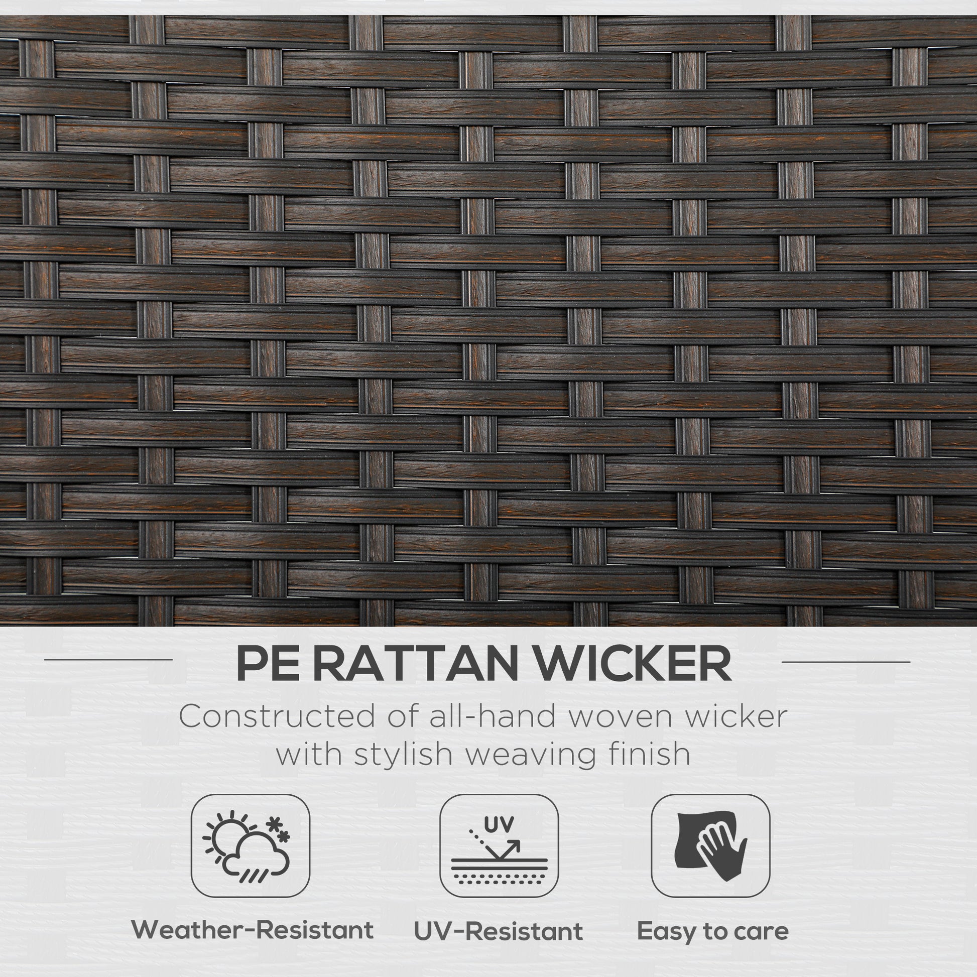 Make the outside of your home just as inviting as the inside. The Outsunny cushioned 3 seater rattan sofa is made of steel with handwoven, all-weather PE wicker for a classic look and greater strength. Our patio sofa is a plush, tufted accent to match your existing furniture, making it excellent for the patio, porch, or poolside. Decorative and functional, it creates an inviting setting that your family will want to use year-round. Get out and get comfy with an Outsunny outdoor couch. Features: - Solid steel frame wrapped in water-resistant PE rattan for long-term usage - 4" thick padded cushions for the comfort and durability - Seat cushion covers with zippers for easy removal and washing - A great fit for the patio, deck, pool, porch, garden, atrium, balcony or terrace - Non-slip feet keep furniture stable - We recommend using a furniture cover for greater longevity - Assembly required Specification: - Color: Mixed Brown, Beige - Materials: Steel, PE Rattan, Polyester, Foam, PP Cotton - Sofa Dimensions: 71.75" W x 30.75" D x 33.5" H - Seat Size: 66.25" W x 21.75" D - Seat Height: 13.75" H - Cushion Thickness: 4" D - Weight Capacity: 792 lbs. - Item Label: 84G-328V01MB Package Includes: - 1 x Rattan Three-Seat Sofa - 1 x Seat Cushion - 3 x Back Cushion - 1 x Manual Make the outside of your home just as inviting as the inside. Features: - Solid steel frame wrapped in water-resistant PE rattan for long-term usage - 4" thick padded cushions for the comfort and durability - Seat cushion covers with zippers for easy removal and washing - A great fit for the patio, deck, pool, porch, garden, atrium, balcony or terrace - Non-slip feet keep furniture stable - We recommend using a furniture cover for greater longevity - Assembly required Specification: - Color: Mixed Brown, Beige - Material: Steel, PE Rattan, Polyester, Foam, PP Cotton - Sofa Dimension: 50" W x 30.75" D x 33.5" H - Seat Size: 44" W x 21.75" D - Seat Height: 13.75" H - Cushion Thickness: 4" D - Weight Capacity: 528 lbs - Item Label: 860-328V00MB Package Includes: - 1 x Rattan Loveseat - 1 x Seat Cushion - 2 x Back Cushion - 1 x Manual.