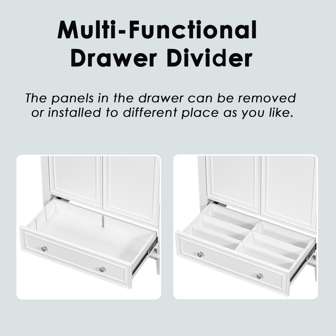 - Multi-functional Cabinet and Drawer: The door of this vanity cabinet is designed as functional storage: a rack with two tiers on the each door for you to store makeup and other stuff. Besides, the lower big drawer can be divided into different parts by the section panel. The panel is removable and you can remove it according to your needs.