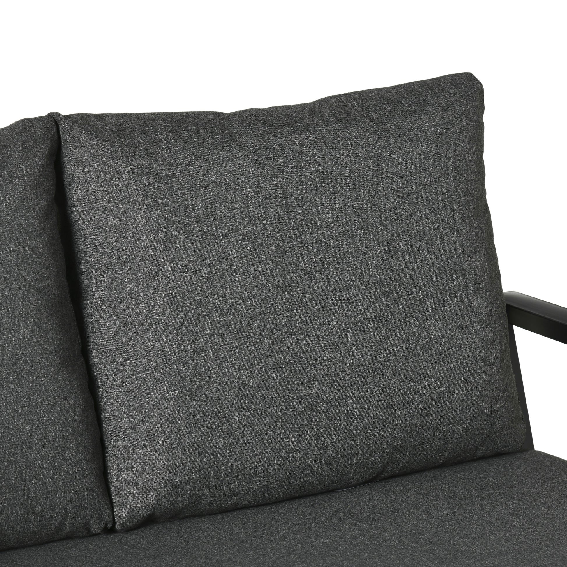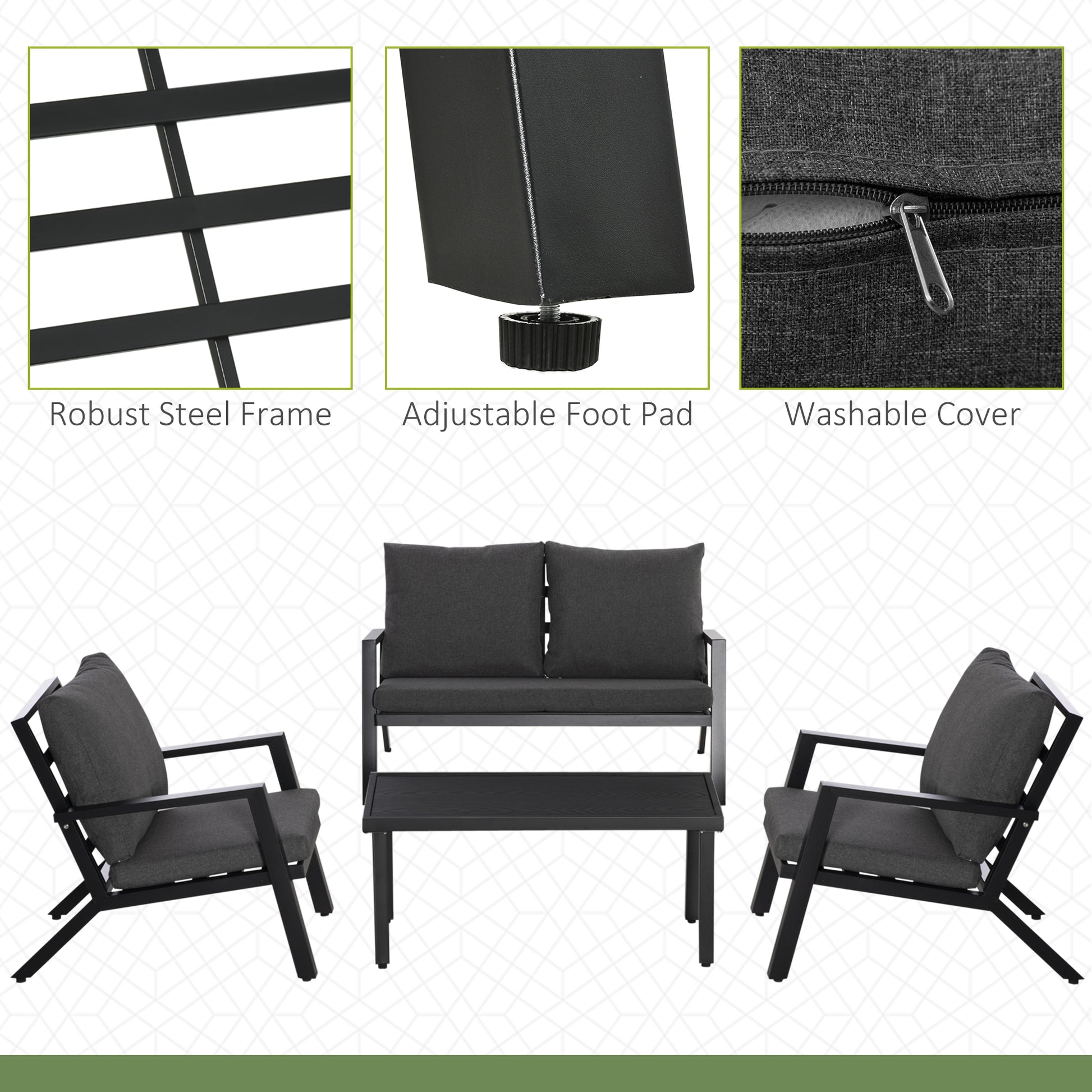 Serve dinner and bring the comforts of the living room to your backyard with Outsunny. This four-piece outside table and chairs set brings everything together. Featuring a loveseat sofa, two chairs, and a center table for friends to drink, have dinner, and decorate. Each seat has thickly padded cushions and ample armrests. Have the rustic look of wood outside. Made of strong steel for heavy-duty resistance to bending and a high weight capacity, this was built with outdoor in mind. Features: - Four-piece backyard furniture set with two armchairs, a sofa loveseat, and a coffee table - Incline backrest and ample armrests to better support your body - Thick, soft cushions offers great comfort - Heavy-duty steel frame for strong foundation - Metal tabletop with wood grain pattern is easy to clean yet stylish - Adjustable foot pads to stay stable and stop scratching - Assembly required Specification: - Color: Black Frames, Grey Cushions - Material: Steel, Polyester, Sponge - Loveseat Dimensions: 48.75" W x 31.5" D x 29.5" H - Single Armchair Dimensions: 25.25" W x 31.5" D x 29.5" H - Coffee Table Dimensions: 39.25" L x 19.75" W x 17" H - Seat Size: 21.25" W x 20.75" D (single chair), 45" W x 20.75" D (loveseat) - Seat Height (excluding seat cushion): 13" H - Back Size: 20" L x 21.25" W x 15.25" H (single), 20" L x 45" W x 15.25" H - Weight Capacity: 704 lbs. (loveseat), 352 lbs. (single sofa), 66 lbs. (coffee table) - Item Label: 84B-771 Package Includes: - 2 x Armchair - 1 x Loveseat - 1 x Coffee Table - 7 x Cushion - 1 x Manual.