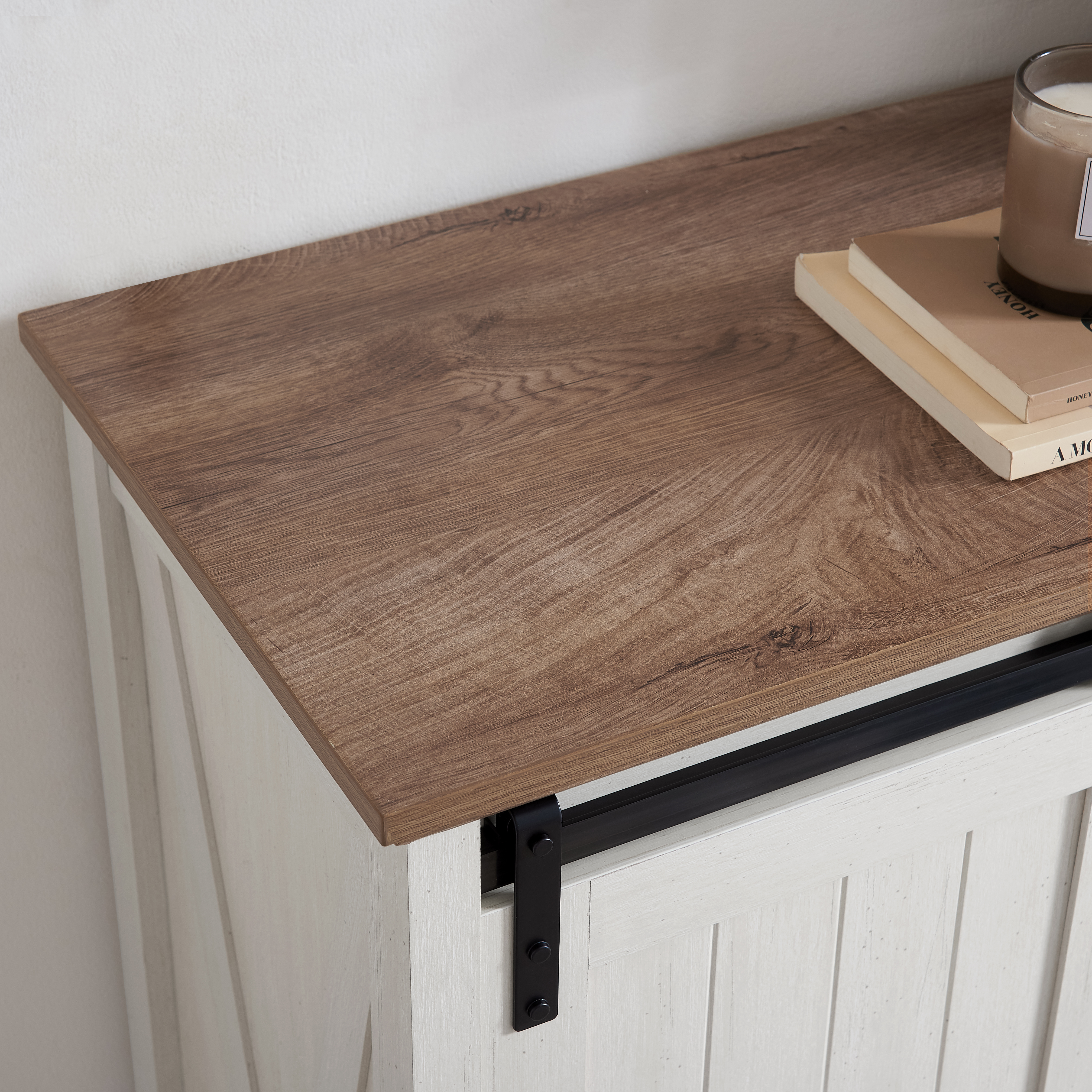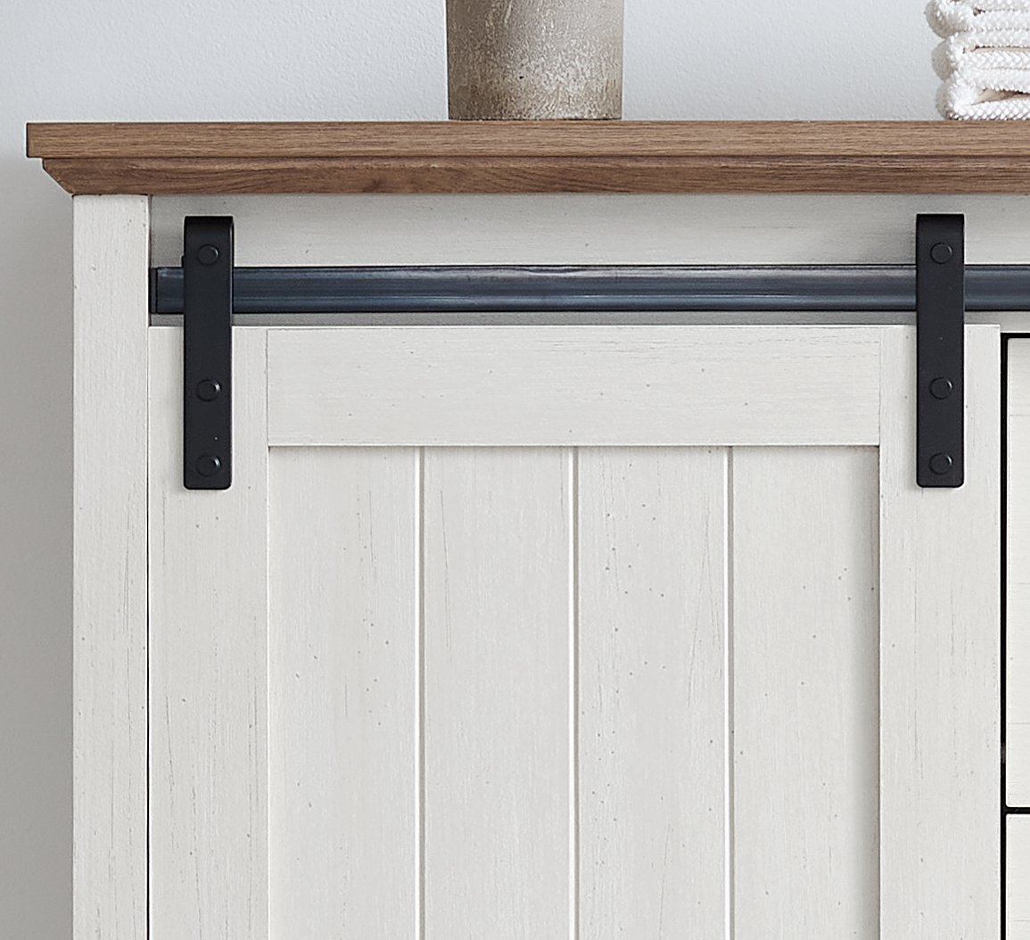 - Sliding Door:The farmhouse-inspired, space-saving barn door elegantly glides open along a robust metal track, unveiling adjustable shelving that offers the flexibility to conceal or display your storage items at will. This shelf features three height-adjustable tiers and is also removable, facilitating versatile organization for variously sized belongings.