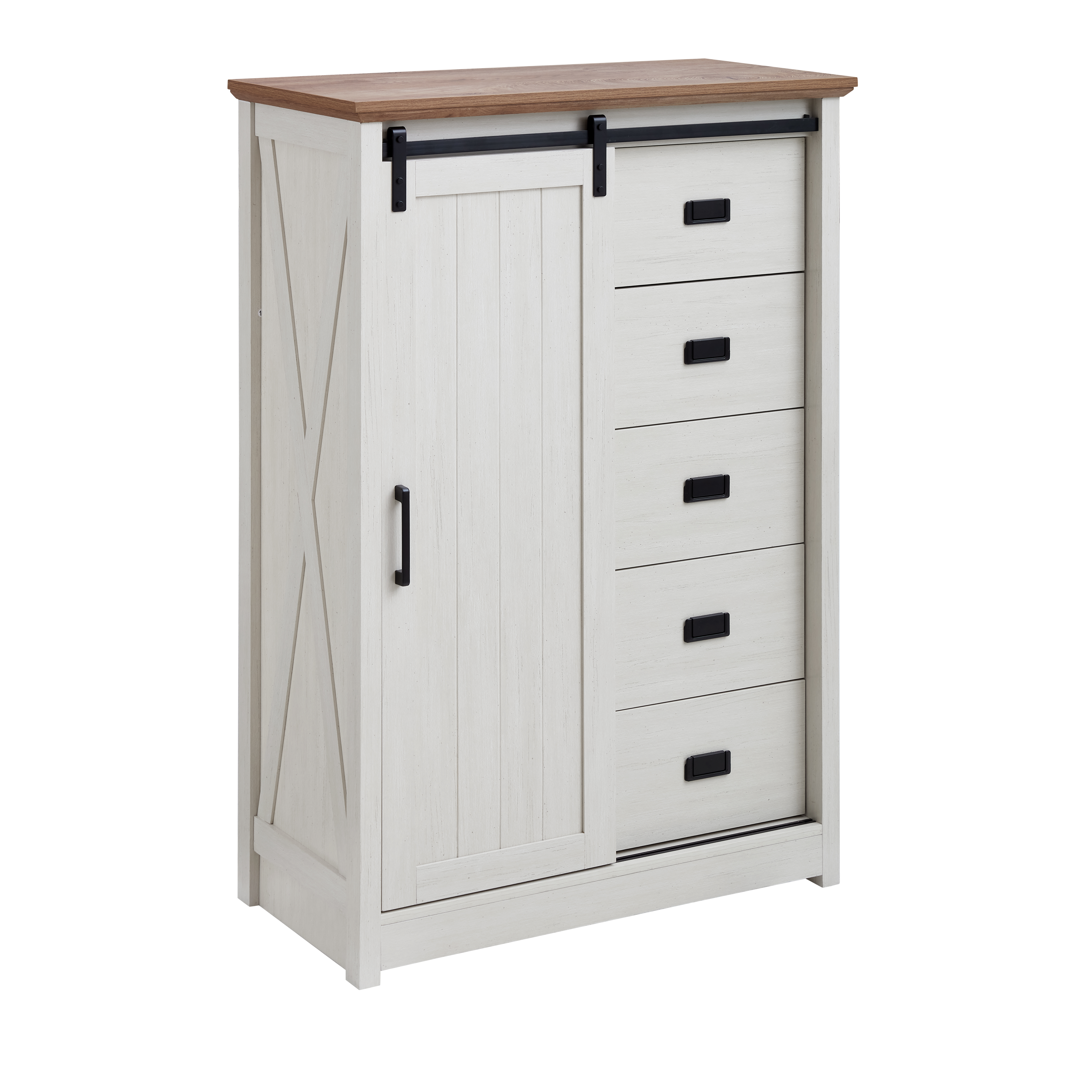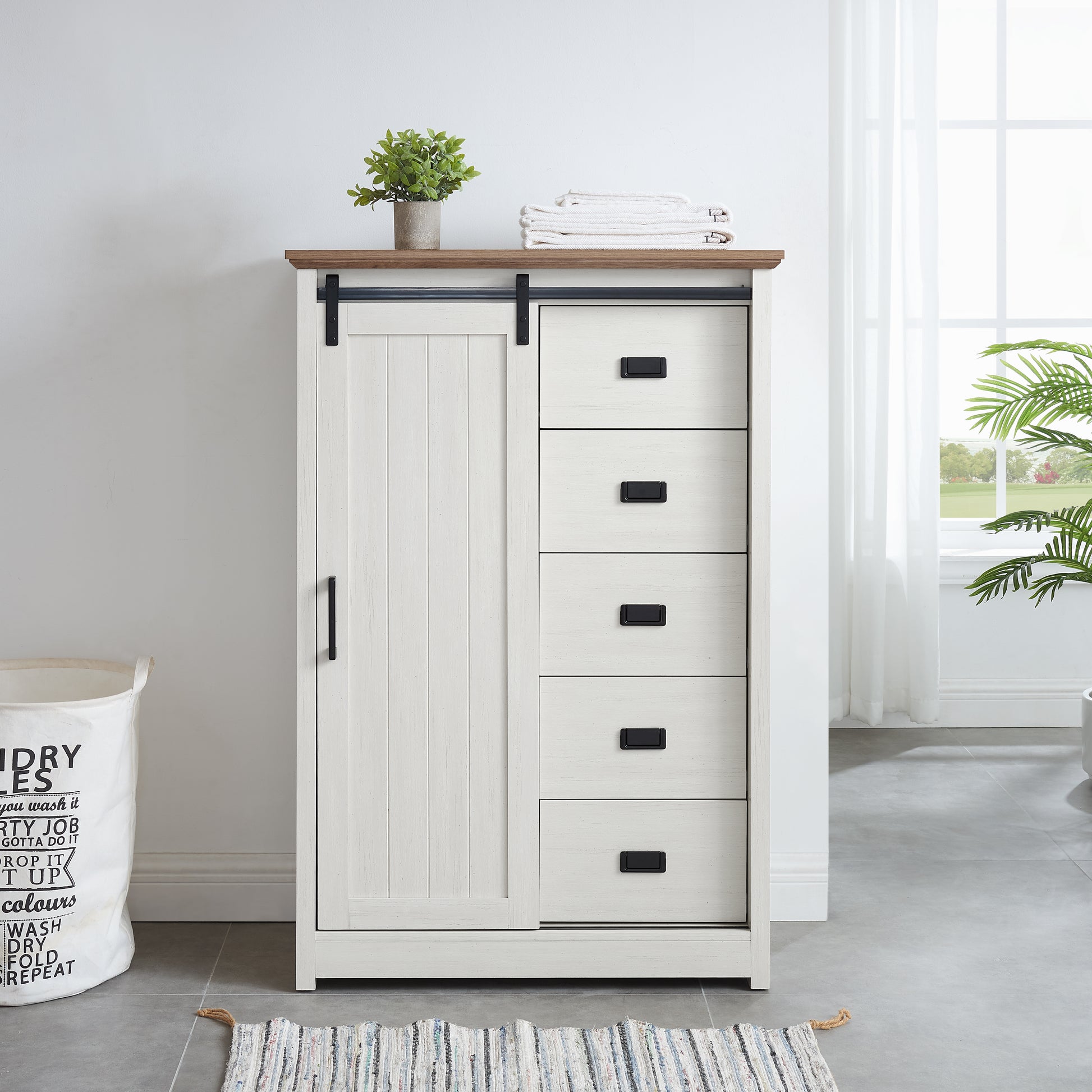 5 Drawers Dresser W Sliding Barn Door, Farmhouse Modern Tall Dresser 5 Chest Of Drawers, Storage Organizer Dresser For Bedroom, Hallway, Living Room, Kids Room WHITE