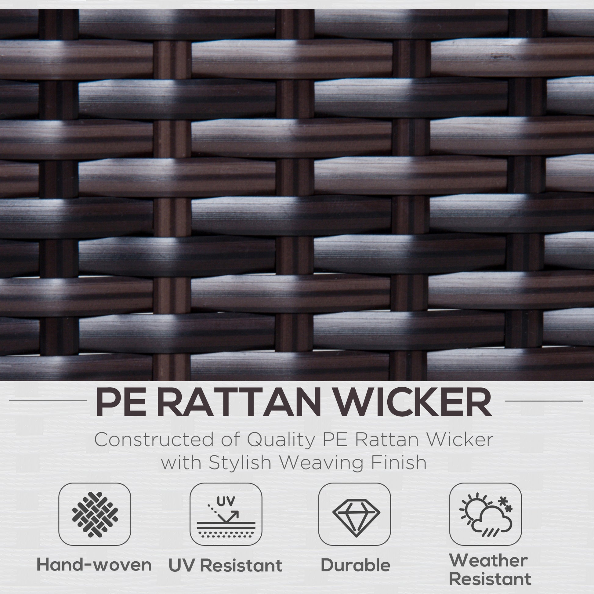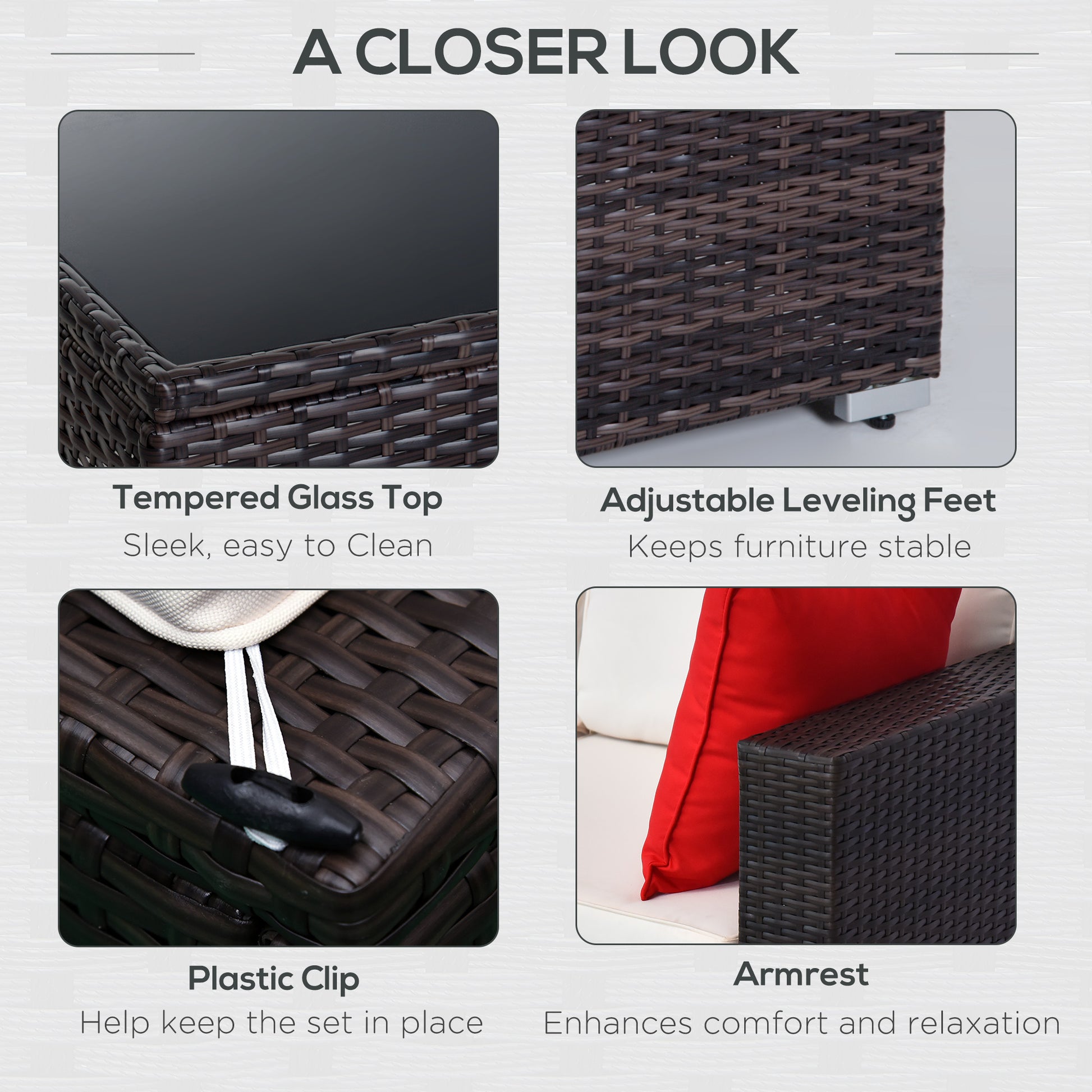 Our five-piece rattan patio sectional set brings the comforts of the living room to the backyard. Everything is there: a couch composed of two corners and a center section, an ottoman footrest, and a tempered glass table. Enjoy perks like throw pillows, thickly padded cushions, and a place to put your feet up in the great outdoors. Offering a home base for outdoor activities, it easily becomes the icing on top of pool parties, picnics, and backyard barbeques. Get out, get comfy, get Outsunny. Features: - Five-piece outdoor sectional furniture set with a sofa to seat three adults - PE rattan offers the same handwoven style as classic wicker with better outdoor endurance - Heavy-duty galvanized steel frame - Throw pillows and 4" thick seat and backrest cushions - You can remove the zippered cushion/pillow covers to spot-clean them when they become dirty - A dining space that wipes clean, so you don't have to worry about spills Specification: - Rattan Color: Coffee - Cushion Color: Cream White - Throw Pillow Color: Red - Materials: PE Rattan, Galvanized Steel - Corner Section Size: 29.5" W x 29.5" D x 25.25" H - Stand Alone Size: 26.5" W x 29.5" D x 25.25" H - Ottoman Size: 29.5" W x 29.5" D x 13" H - Coffee Table Size: 35.5" W x 19.75" D x 13" H - Seat Size: 24.75" W x 24.75" W - Seat to Floor Size: 13" H - Weight Capacity: 395 lbs. / per seat, 110 lbs. (Table) - Item Label: 01-0317 Package Includes: - 2 x Corner Segment - 1 x Stand Alone Segment - 1 x Footrest - 1 x Table - 2 x Throw Pillow - 4 x Seat Cushion - 3 x Back Cushion This seven-piece rattan sectional set brings the comforts of your living room to your backyard. Everything is there: two corner sofa sections, four stand-alone couch sections, and a coffee table. Enjoy the perks of home, like throw pillows and thickly padded cushions in the great outdoors. Easy to rearrange and capable of customizing to your occasion, it offers a versatile seating solution for six. Get out, get comfortable, get Outsunny. Features: Features:- Sectional patio furniture set reconfigures for several layouts and seats six - Easy-to-clean tempered glass coffee table - Cushions on every seat and backrest that buckle on - Two throw pillows - Cushion covers remove for cleaning - Heavy duty, water-safe galvanized steel frame - Adjustable footpads to prevent floor scratching - Note: This set is divided into 3 boxes, that may be delivered at different times - Assembly required Specification: Specifications:- Rattan Color: Espresso - Cushion Color: Beige - Material: Steel Frame, PE Rattan - Corner Section Dimensions: 29.5" L x 29.5" W x 24.5" H - Middle Section Dimensions: 29.5" L x 25.5" W x 24.5" H - Coffee Table Size: 28.75" L x 25.5" W x 12.5" H - Pillow Size: 15.75" L x 15.75" W - Seat Size: 25.5" W x 25.5" D x 12.75" H - Sofa Weight Capacity: 350 lbs. - Table Weight Capacity:155 lbs. - Custom Label: 860-020BU Package Includes: - 4 x Middle Sofa Section - 2 x Corner Sofa Section - 1 x Coffee Table - 6 x Seat Cushion - 8 x Back Cushion - 2 x Throw Pillows - 1 x Manual This seven-piece rattan sectional set brings the comforts of your living room to your backyard. Features: - Outdoor sectional sofa set that reconfigures for several layouts and seats six - Easy-to-clean tempered glass coffee table - Cushions on every seat and backrest that buckle on - Cushion covers remove for cleaning - Heavy duty, water-safe galvanized steel frame - Adjustable footpads to prevent floor scratching - Assembly required Specification: - Color: Dark Brown Rattan, Dark Blue Cushion - Materials: Steel Frame, PE Rattan - Corner Section Dimensions: 29.5" L x 29.5" W x 24.5" H - Middle Section Dimensions: 29.5" L x 25.5" W x 24.5" H - Coffee Table Size: 28.75" L x 25.5" W x 12.5" H - Pillow Size: 17" L x 17" W - Seat Size: 25.5" W x 25.5" D x 12.75" H - Sofa Weight Capacity: 350 lbs. - Table Weight Capacity: 155 lbs. - Custom Label: 860-020V01BU Package Includes: - 4 x Middle Sofa Section - 2 x Corner Sofa Section - 1 x Coffee Table - 6 x Seat Cushion - 8 x Back Cushion - 2 x Throw Pillows - 1 x Manual This seven-piece rattan sectional set brings the comforts of your living room to your backyard. Features: - Outdoor sectional sofa set that reconfigures for several layouts and seats six - Easy-to-clean tempered glass coffee table - Cushions on every seat and backrest that buckle on - Cushion covers remove for cleaning - Heavy duty, water-safe galvanized steel frame - Adjustable footpads to prevent floor scratching - Assembly required Specification: - Color: Mixed Gray Rattan, Gray Cushion - Materials: Steel Frame, PE Rattan - Corner Section Dimensions: 29.5" L x 29.5" W x 24.5" H - Middle Section Dimensions: 29.5" L x 25.5" W x 24.5" H - Coffee Table Size: 28.75" L x 25.5" W x 12.5" H - Pillow Size: 17" L x 17" W - Seat Size: 25.5" W x 25.5" D x 12.75" H - Sofa Weight Capacity: 350 lbs. - Custom Label: 860-020V01GY Package Includes: - 4 x Middle Sofa Section - 2 x Corner Sofa Section - 1 x Coffee Table - 6 x Seat Cushion - 8 x Back Cushion - 2 x Throw Pillows - 1 x Manual This seven-piece rattan sectional set brings the comforts of your living room to your backyard. Features: Features:- Sectional patio furniture set that reconfigures for several layouts and seats six - Easy to wipe HDPE slat table - Cushions on every seat and backrest that buckle on - Cushion covers remove for cleaning - Heavy duty, water-safe galvanized steel frame - Adjustable footpads to prevent floor scratching - Assembly required Specification: Specifications:- Rattan Color: Gray - Cushion Color: Stripe Beige, Gray - Materials: Steel Frame, PE Rattan - Corner Section Dimensions: 29.5" L x 29.5" W x 24.5" H - Middle Section Dimensions: 29.5" L x 25.5" W x 24.5" H - Coffee Table Size: 28.75" L x 25.5" W x 12.5" H - Pillow Size: 15.75" L x 15.75" W - Seat Size: 25.5" W x 25.5" D x 12.75" H - Sofa Weight Capacity: 350 lbs. - Custom Label: 860-020V03 Package Includes: - 4 x Middle Sofa Section - 2 x Corner Sofa Section