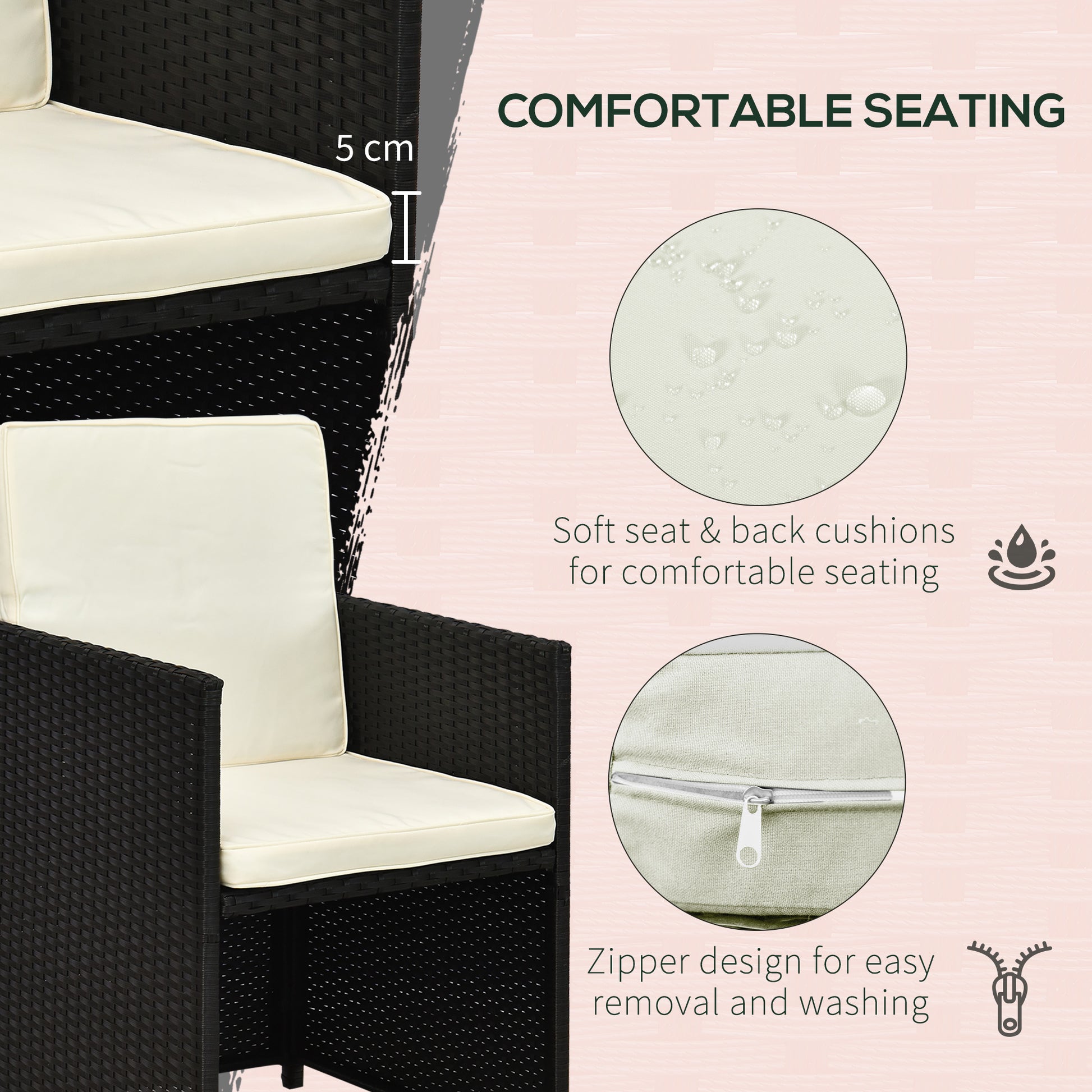 This nine-piece outdoor rattan dining set brings the comforts of your kitchen outside. Everything is all in the same place: four chairs, two easy-store ottomans, and a glass dinner table. Enjoy perks like tilted backrests and thickly padded cushions in the great outdoors. This set is perfect for pool parties, picnics, and barbeques. Made of water-resistant polyethylene plastic with a load-bearing powder-coated steel frame, this set was made with outdoor in mind. Get inside out with Outsunny. Features: - Nine-piece outdoor rattan dining furniture set that seats four adults - Water-resistant polyethylene plastic with a load-bearing, heavy-duty powder-coated steel frame - Tilted backrests and thickly padded seat and backrest cushions - Easy-store ottomans nest neatly under the table - A dining space that wipes clean, so you don't have to worry about spills Specification: - Color: Black, Cream White - Material: PE Wicker, Steel, Polyester Fabric, Tempered Glass - Chair Weight Capacity: 350 lbs. - Ottoman Weight Capacity: 220 lbs. - Table Weight Capacity: 155 lbs. - Ottoman Size: 16.25" L x 16.25" W x 13.75" H - Table Size: 43" L x 43" W x 28.5" H - Chair Size: 22" L x 20.5" W x 34.25" H - Seat Size: 17.75" W x 20.5" D - Seat Height (without cushion): 16.5" H - Tempered Glass Thickness: 5mm Package Includes: - 4 x Chairs - 4 x Ottomans - 1 x Table - 12 x Cushions - 1 x Manual Create a picture perfect patio with our 9 pc Rattan Nesting Dining set. Built for both style and resilience, a rust-resistant steel frame adds support while PE coated rattan adds a stylish facade that is heat and weather resistant. The ottomans and chairs nest conveniently under the table to create a compact storage unit. A tempered glass tabletop creates a unique surface that is both stylish and easy to clean. Features: - 9 piece dining set includes 4 single cushioned chairs, 4 ottomans, and 1 glass top dining table - Ottomans and chairs nest neatly under the table for compact storage - Made from high quality all-weather PE rattan wicker and steel frame - Cushions filled with thick fabric for added comfort - Zippered cushion covers made from outdoor polyester cloth - Table with tempered glass is easy to clean Specification: - Color: Grey, Mixed Grey - Material: PE Wicker, Steel, Polyester Fabric, Tempered Glass - Chair Weight Capacity: 350 lbs - Ottoman Weight Capacity: 220 lbs - Table Weight Capacity: 155 lbs - Ottoman Size: 16.25" L x 16.25" W x 13.75" H - Table Size: 43" Lx 43" W x 28.5" H - Chair Size: 22" L x 20.5" W x 34.25" H - Seat Size: 17.75" W x 20.5" D - Seat Height (without cushion): 15.75" H - Tempered Glass Thickness: 5mm This nine-piece outdoor rattan dining set brings the comforts of your kitchen outside. Features: - Nine-piece outdoor rattan dining furniture set that seats four adults - Water-resistant polyethylene plastic with a load-bearing, heavy-duty powder-coated steel frame - Tilted backrests and thickly padded seat and backrest cushions - Easy-store ottomans nest neatly under the table - A dining space that wipes clean, so you don't have to worry about spills Specification: - Color: Light Gray, Dark Gray - Material: PE Wicker, Steel, Polyester Fabric, Tempered Glass - Chair Weight Capacity: 350 lbs. - Ottoman Size: 16.25" L x 16.25" W x 13.75" H - Table Size: 43" L x 43" W x 28.5" H - Chair Size: 22" L x 20.5" W x 34.25" H - Seat Size: 17.75" W x 20.5" D - Seat Height (without cushion): 16.5" H - Tempered Glass Thickness: 5mm Package Includes: - 4 x Chairs - 4 x Ottomans - 1 x Table - 12 x Cushions - 1 x Manual.