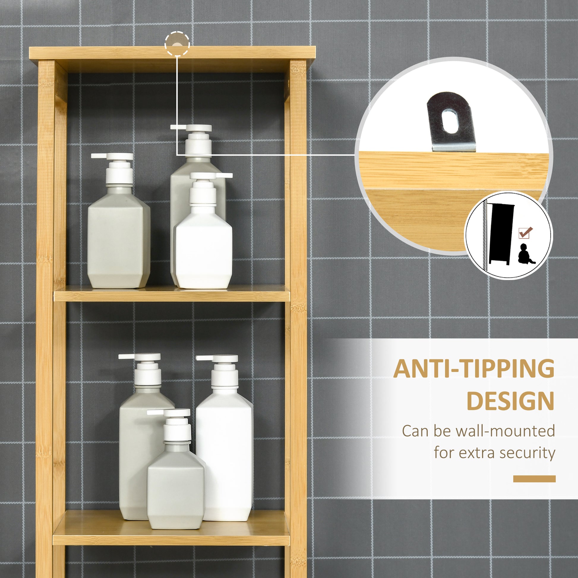 This tall yet narrow bathroom cabinet from kleankin is classic and a perfect accompaniment to various spaces and home styles. The design of 3 shelves and 1 cabinet, gives convenient and independent storage spaces for multiple people or different needs. Not only every-day essentials, you can display aromatherapy diffusers, candles and other adornments on the shelves, building a warm atmosphere. Let's enjoy a hassle-free morning and a relaxing after-work time with this stylish floor stand. Features: - Compact and tall cabinet perfectly fits in narrow spaces. - Suitable and useful in bathroom, living room, bedroom, hallway, and kitchen. - Constructed of MDF board and bamboo frame for solid construction. - Features 1 closed cupboard and 3 fixed shelves for various storage needs. - Slatted door provides good ventilation and fashion. - Grab handle can be used to open the cupboard easily. - Anti-tipping design ensures your safety. - Assembly Required Specification: - Color: Natural. - Material: MDF, Bamboo. - Overall Dimension: 13.5"L x 11.75"W x 68"H. - Cupboard Inner Size: 11.75"W x 10"D x 29.25"H. - Shelf Dimension: 11.25"W x 11"D x 10.75"H (each tier). - Bottom to the Ground: 2.25". - Weight Capacity: 55lbs (total), 10lbs (shelf). - Item Label: 834-408V80. - 1 x Bathroom Floor Cabinet. - 1 x Manual Maximize space and minimize clutter with this modern-style bathroom cabinet organizer from kleankin. This eye-catching bathroom storage piece will add a sense of order to your area. Its combination of open and cabinet storage makes it ideal for smaller spaces that require organization. Made of hard-wearing bamboo, the freestanding shelf provides a natural and warm look and is suitable for everyday use. Features: - Compact and tall cabinet perfectly fits in narrow spaces - Natural and warm look is suitable for most bathroom styles, living room, and hallway as well - Features three open compartments, a drawer, and a cabinet for lots of storage and organization - Constructed of bamboo for solid construction - Louvered door of the bottom cabinet can keep items inside ventilated - Anti-tipping design ensures your safety - Assembly Required Specification: - Color: Natural - Material: Bamboo - Overall Dimensions: 12.5" L x 11.75" W x 64.25" H - Open Shelf Size: 11.5" L x 11.25" W x 10"/10"/10" H - Drawer Inner Size: 10.75" L x 10.75" W x 3.5" H - Cabinet Inner Size: 11.5" W x 11.25" D x 11.75/13.75" H - Weight Capacity: 33 lbs. - Item Label: 834-465 Package Includes: - 1 x Bathroom Cabinet - 1 x Manual.