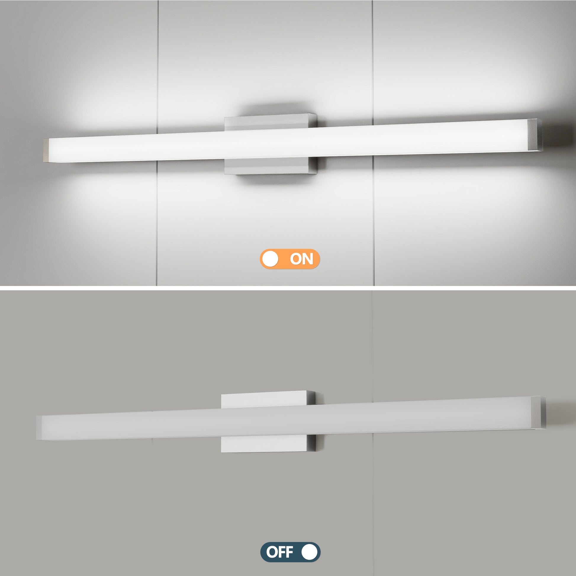 【High Quality】 This light fixture bathroom adds an extremely modern vibe with Brushed Nickel metal hardware and solid white acrylic shade. Both ends of the light fixture are sealed against moisture to prevent water vapor and mosquitoes from entering. Safe to use and easy to clean.