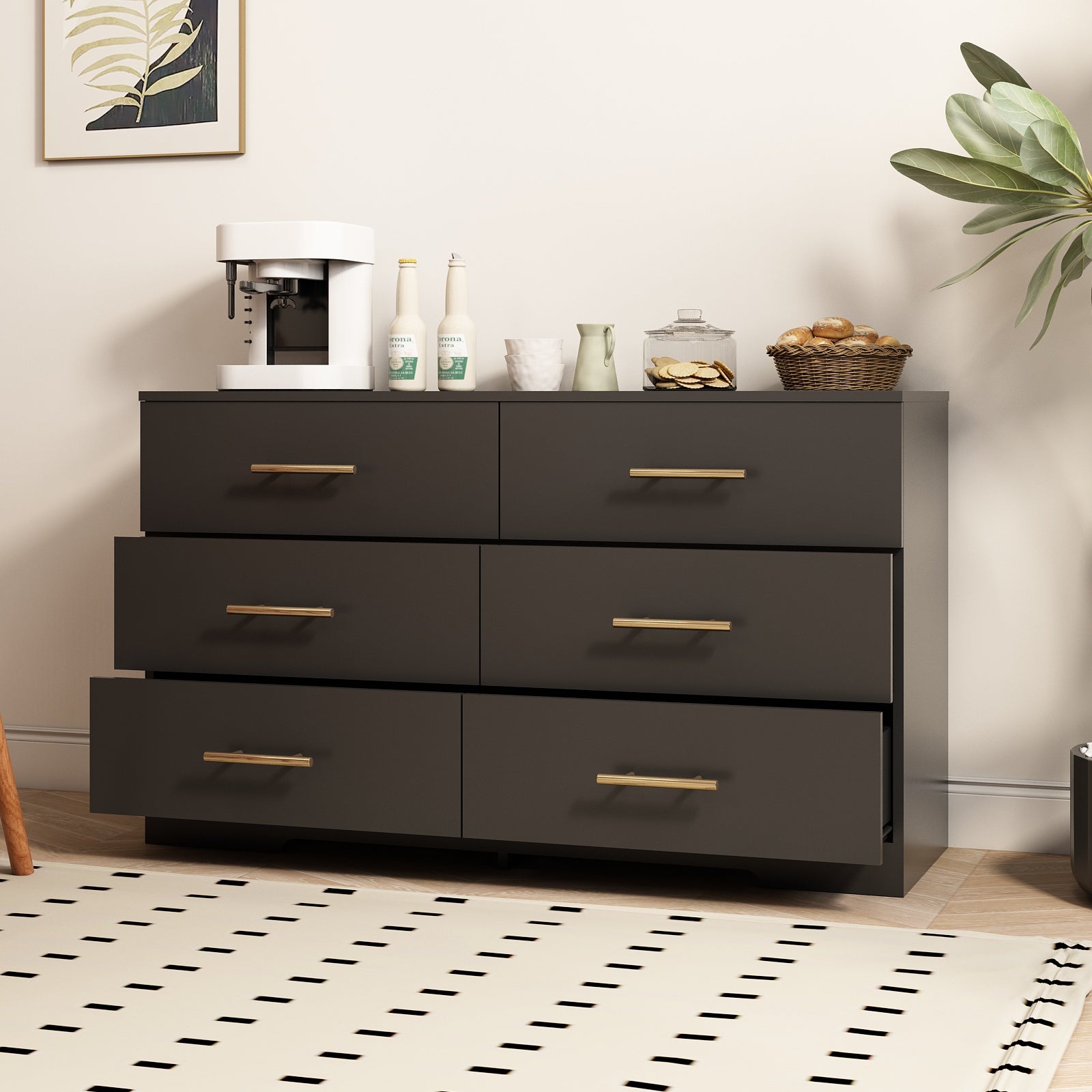 Black Color Large 6 Drawers Chest Of Drawer Dressers Table With Golden Handle