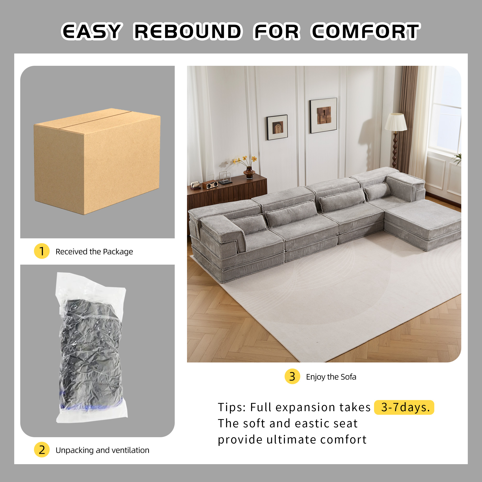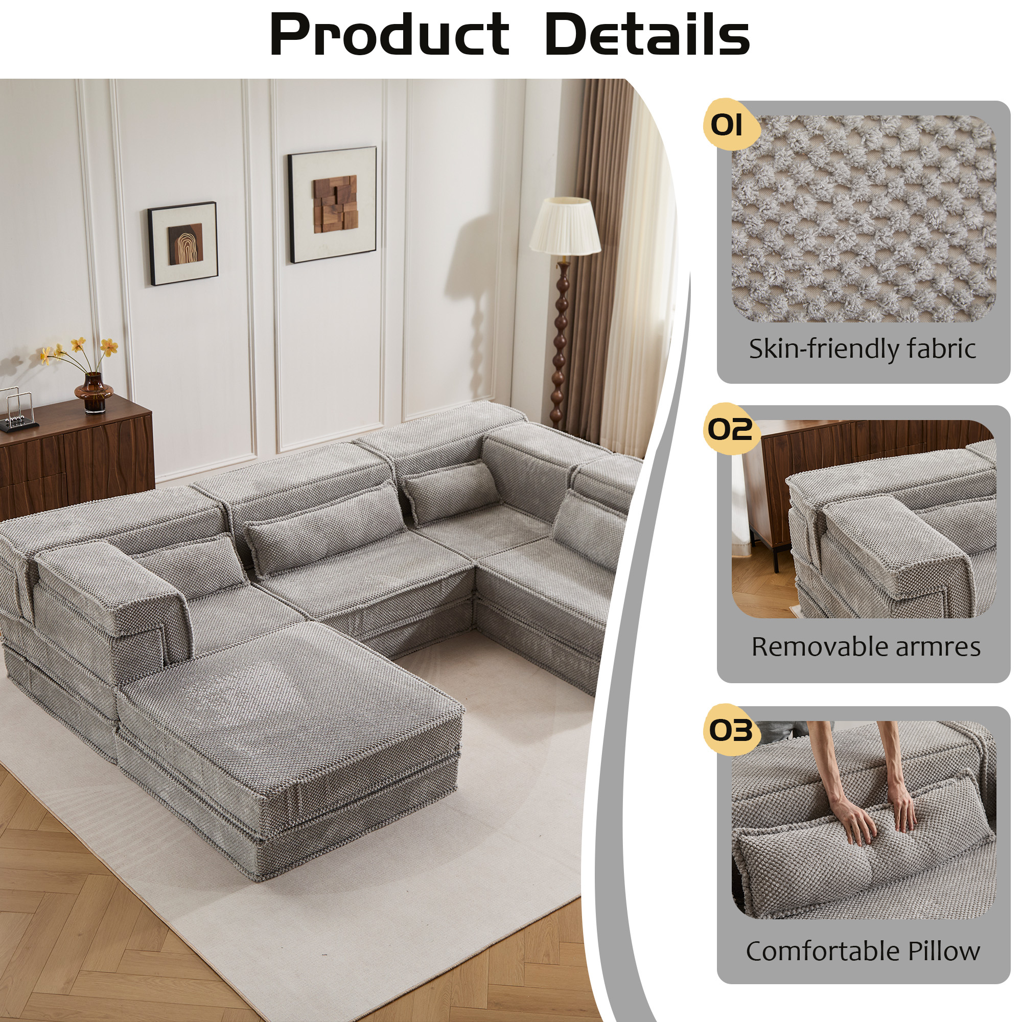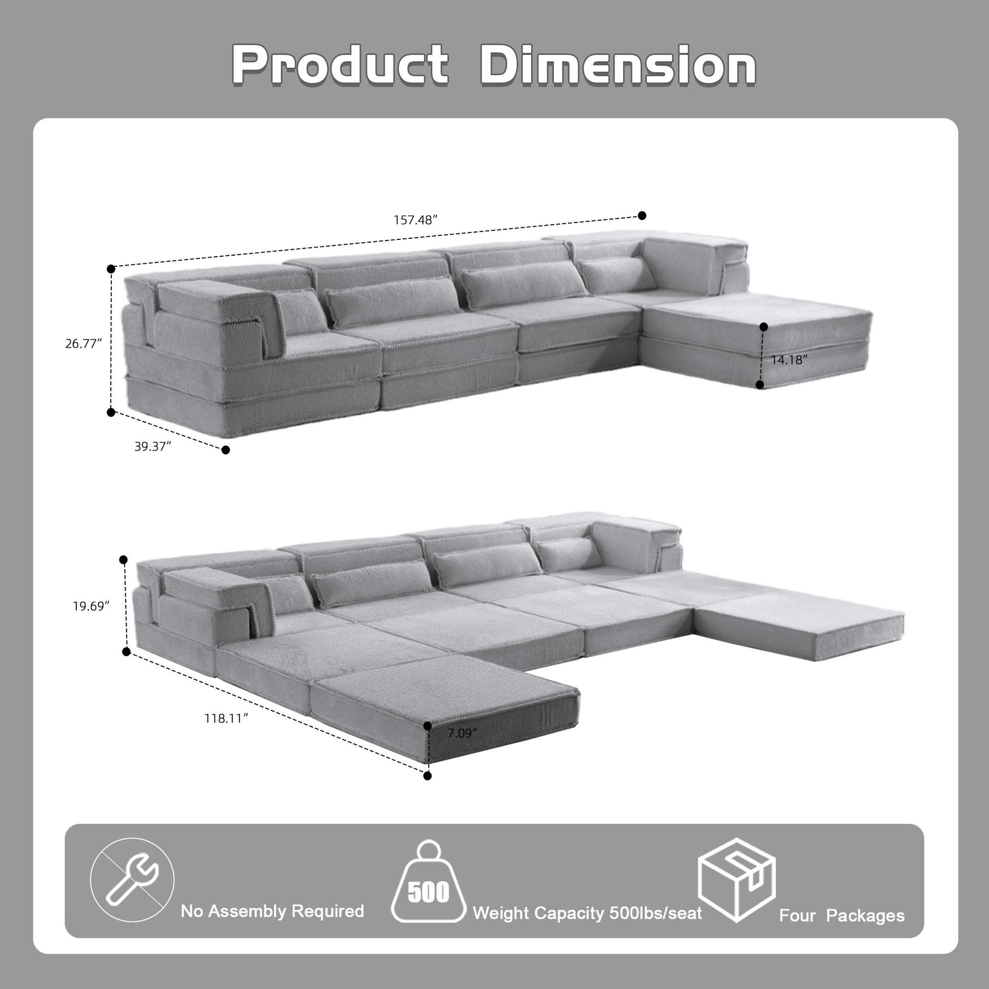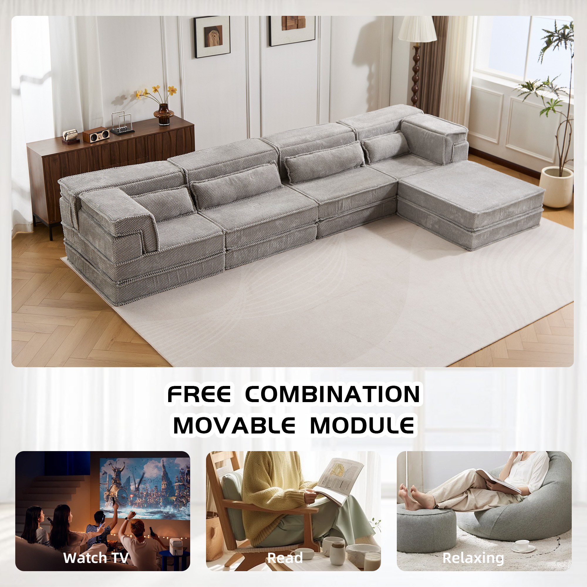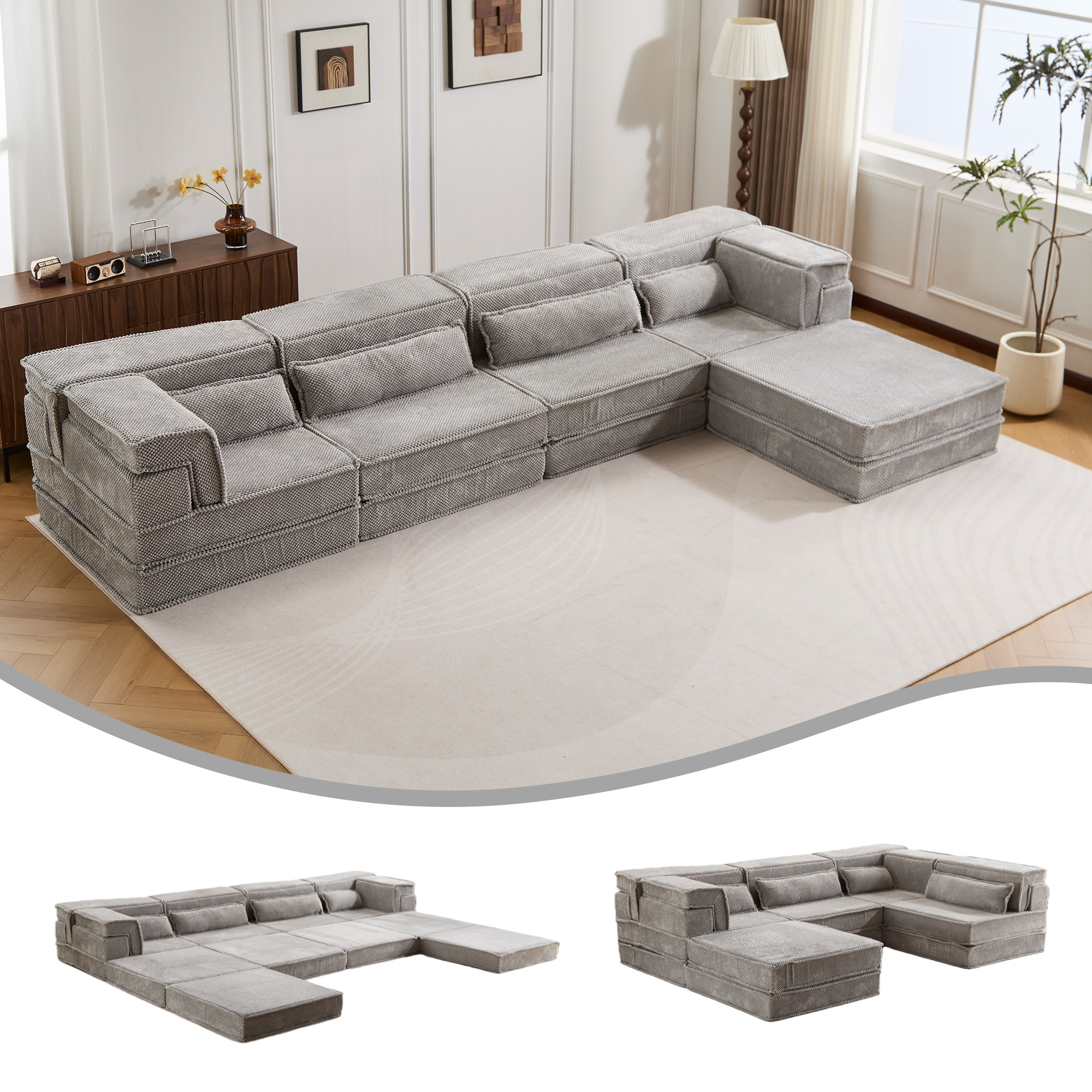 Compression Mahjong Sofa,Convertible Floor Sofa Bed,DIY Boneless Modular Sectional Sofa,No Assembly Required,Circle fleece fabric,Oversized 4 Seater with 1 Ottoman,Light-grey