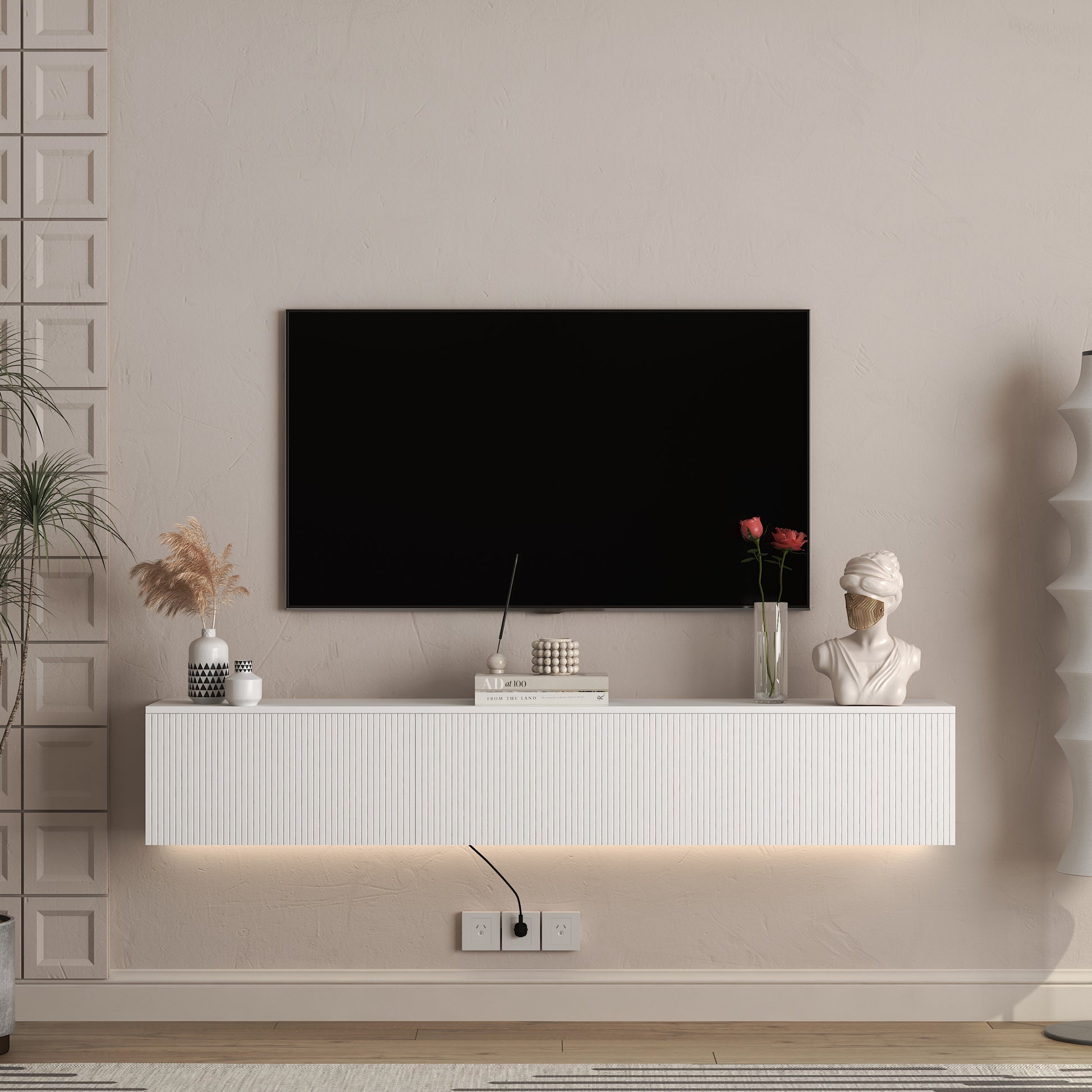 - This wall mounted TV stand has a large storage space, perfect for storing TV components, game accessories, books and decorations. You can also place living room decorations on the TV stand.
