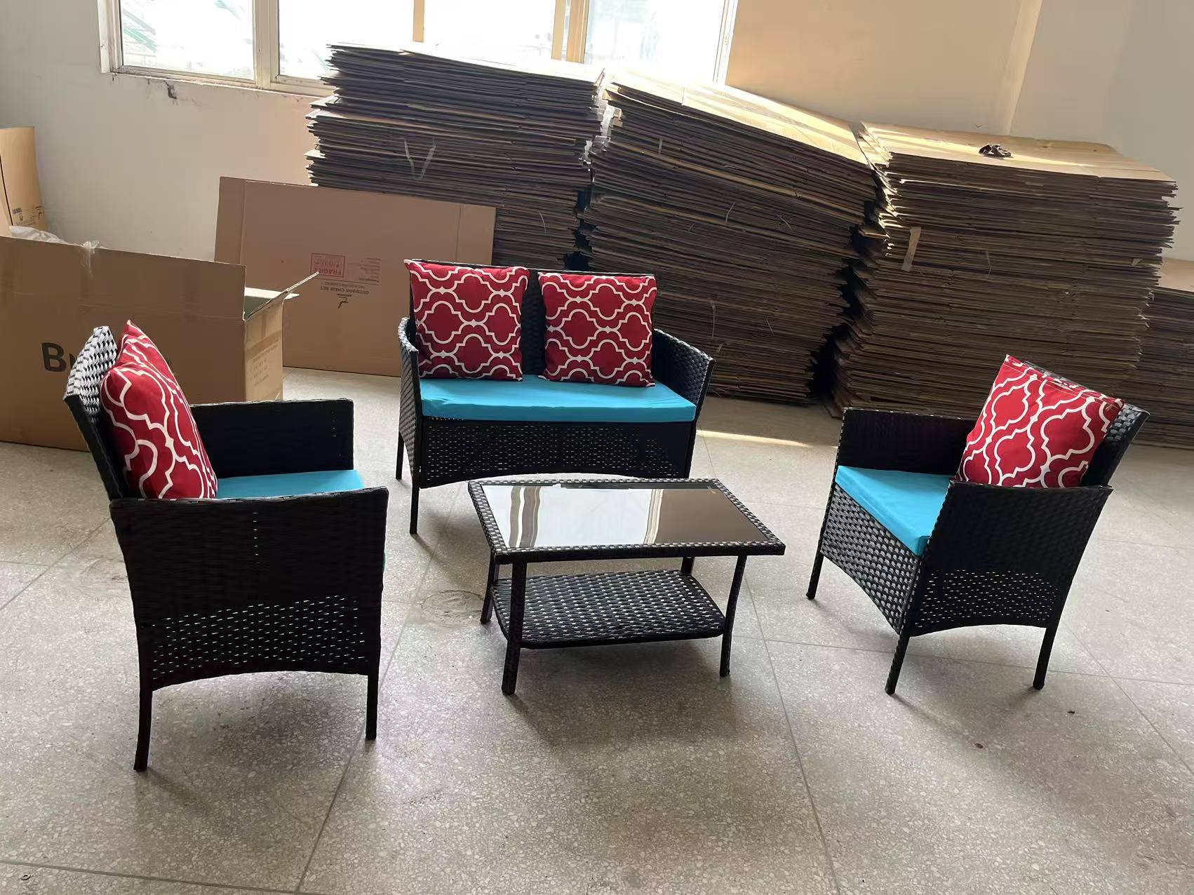 - PE flat rattan 9X1, 1MM, galvanized iron pipe 15*15*0.6 pipe, 170g polyester cloth, 5cm seat cushion, 1200g upright cotton, black silk screen tempered glass, four red and white checkered pillows ! Four-Piece Sofa Set Table With Sofa Chair PE Rattan Outdoor Furniture With Sapphire Blue Color Cushion