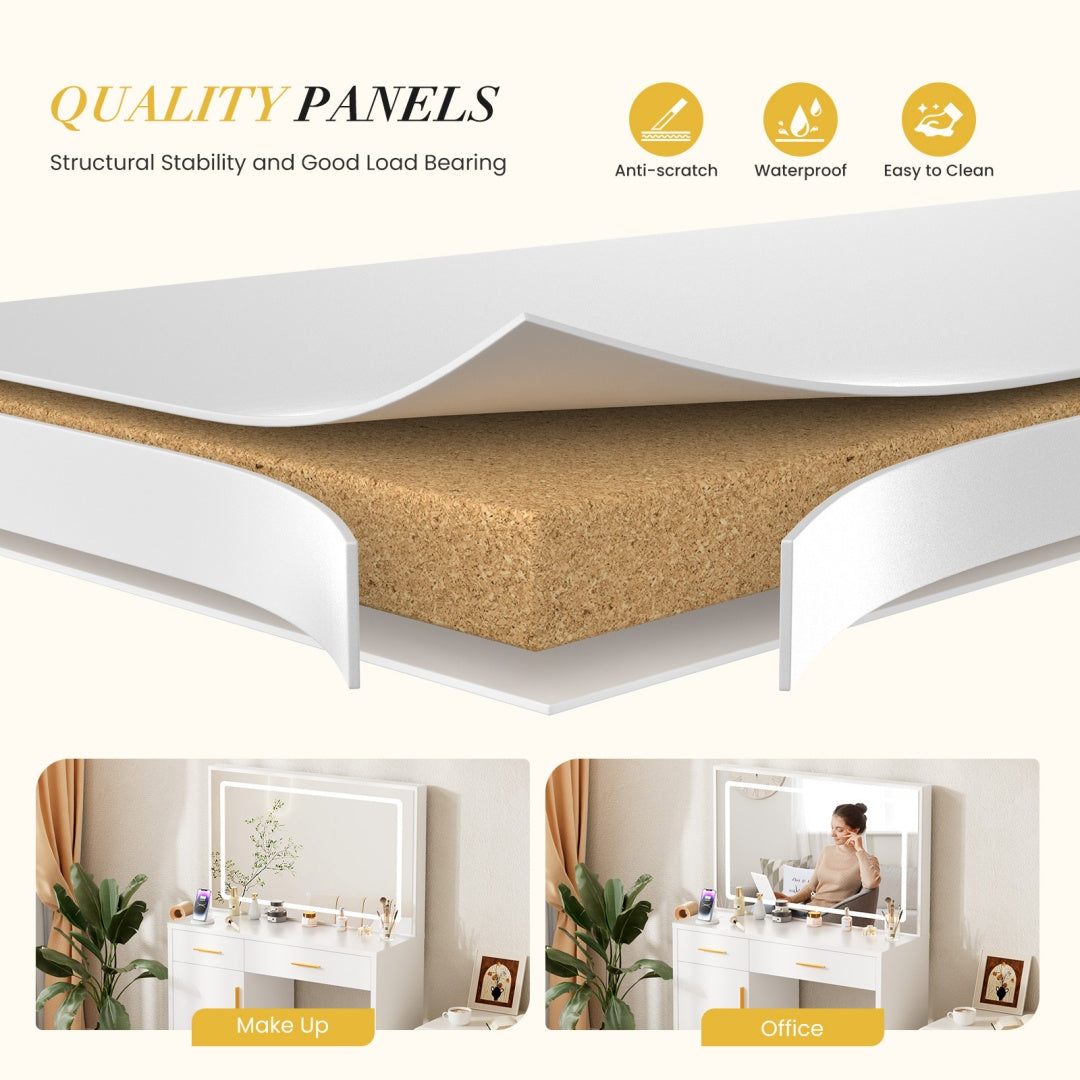 【Built-In Charging Stations】No more fighting over outlets! This vanity desk has 2 AC outlets, 1 USB, and 1 Type-C port. The long 4.9FT cord reaches anywhere. Charge your phone, tablet, or curling iron—all at once.