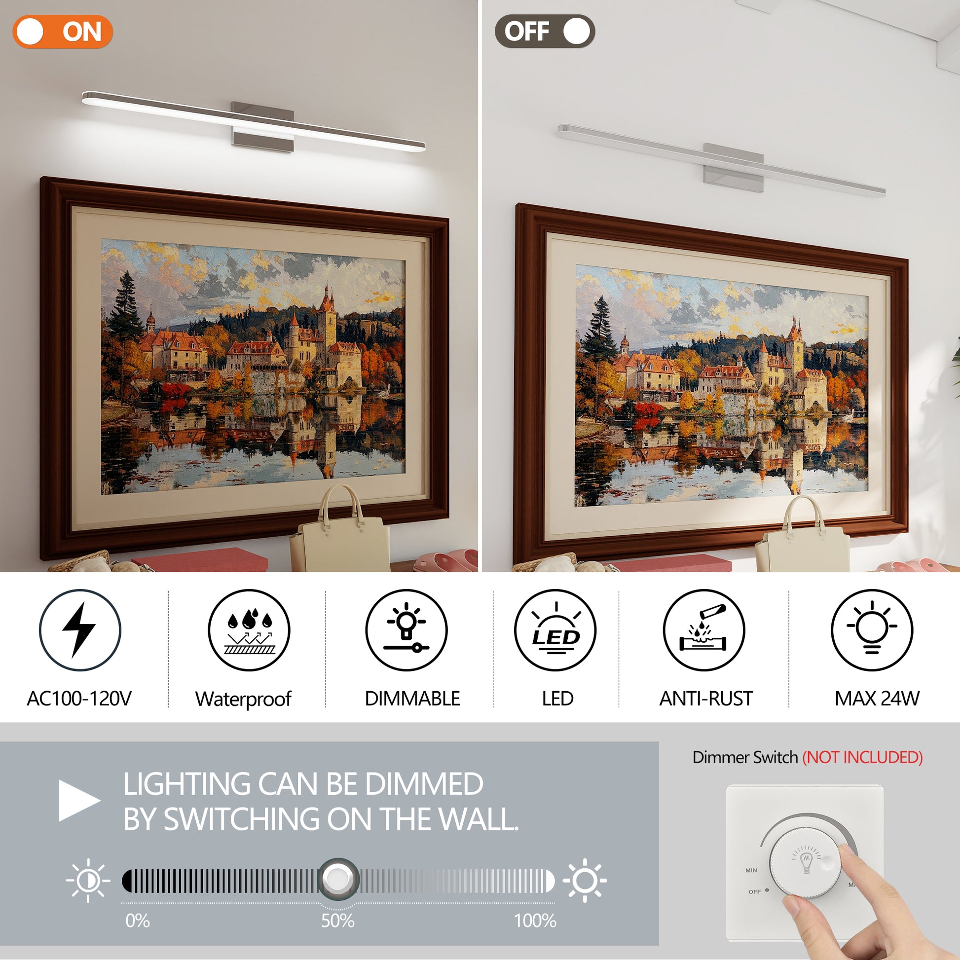 1.DIMMABLE LIGHTING: This 39” Bathroom Lamp over mirror is fully dimmable with a compatible dimmer switch to meet your demands for specific brightness at anytime, quite convenient for daily use(Dimmer Switch not Included)