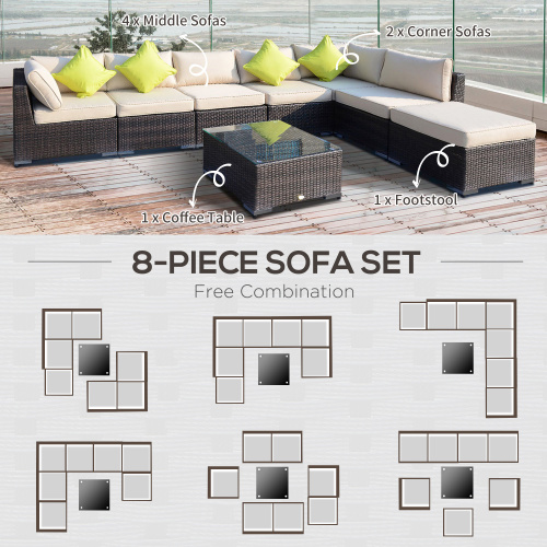 Product Name:Outsunny 8 Pieces PE Rattan Corner Sofa Set with Thick Cushions, Aluminium Outdoor Rattan Garden Furniture Set with Glass Top Table, No Assembly Required, Mixed Brown