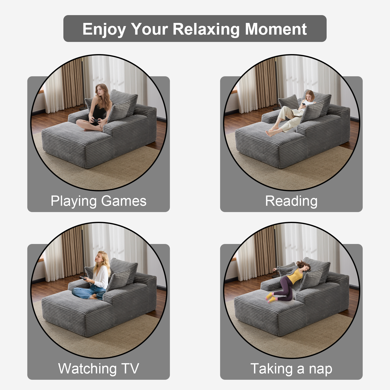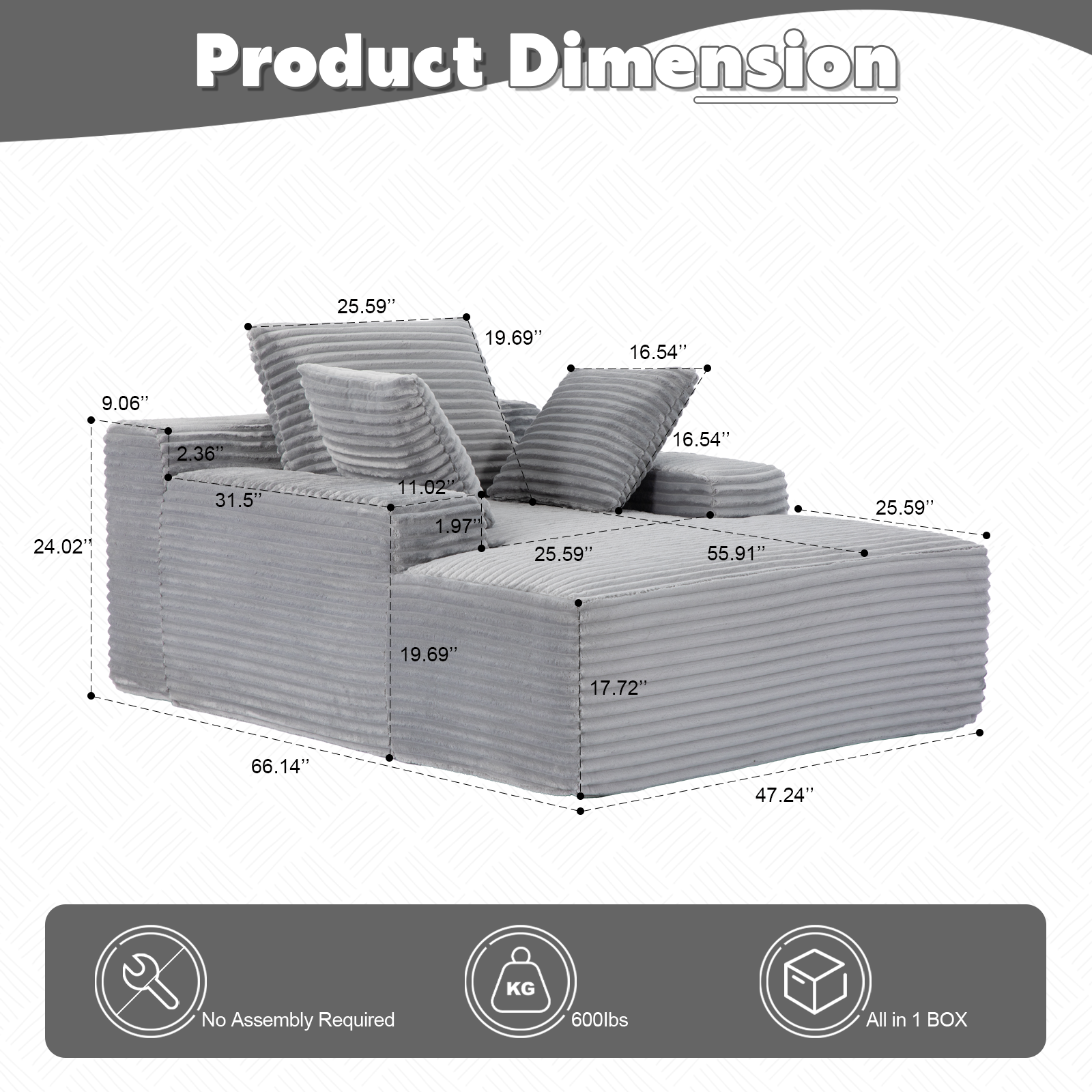 Product Name:Oversized Chaise Lounge Chair Cozy Cloud Couch, Modern Plush Corduroy Upholstered Sleeper Sofa Daybed with 3 Throw Pillows and Wide Armrest for Living Room, No Assembly Required,Grey