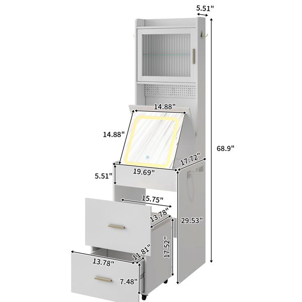 4. Thoughtful Design & Charging Station: The built-in power strip includes 2 standard plug sockets and 2 USB ports, making it easy to charge your devices or use your hair dryer and curling iron while seated at your vanity. It is also equipped with RGB light strip to enhance atmosphere, two coat racks on both sides of the cabinet and a hair dryer rack, catering to various needs.