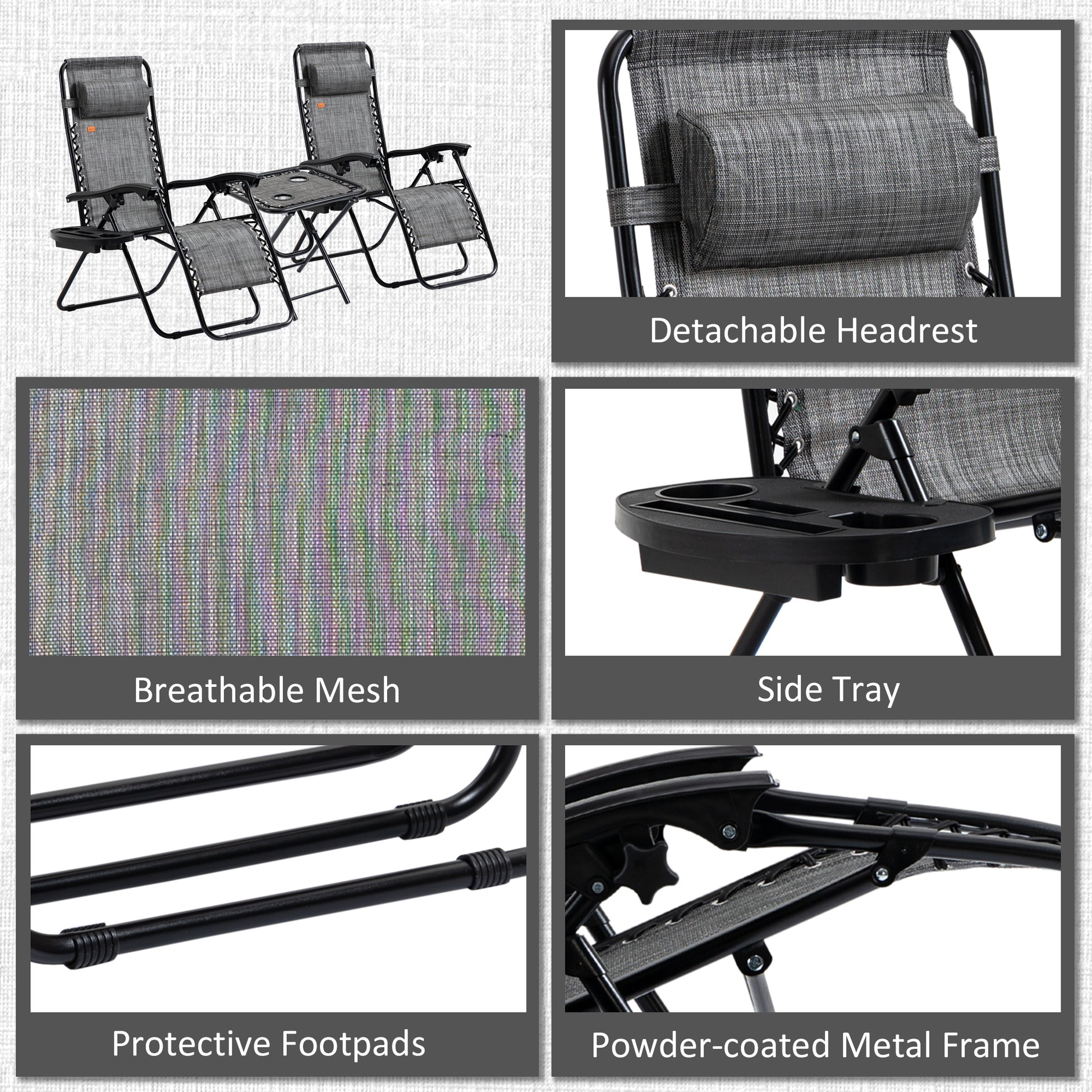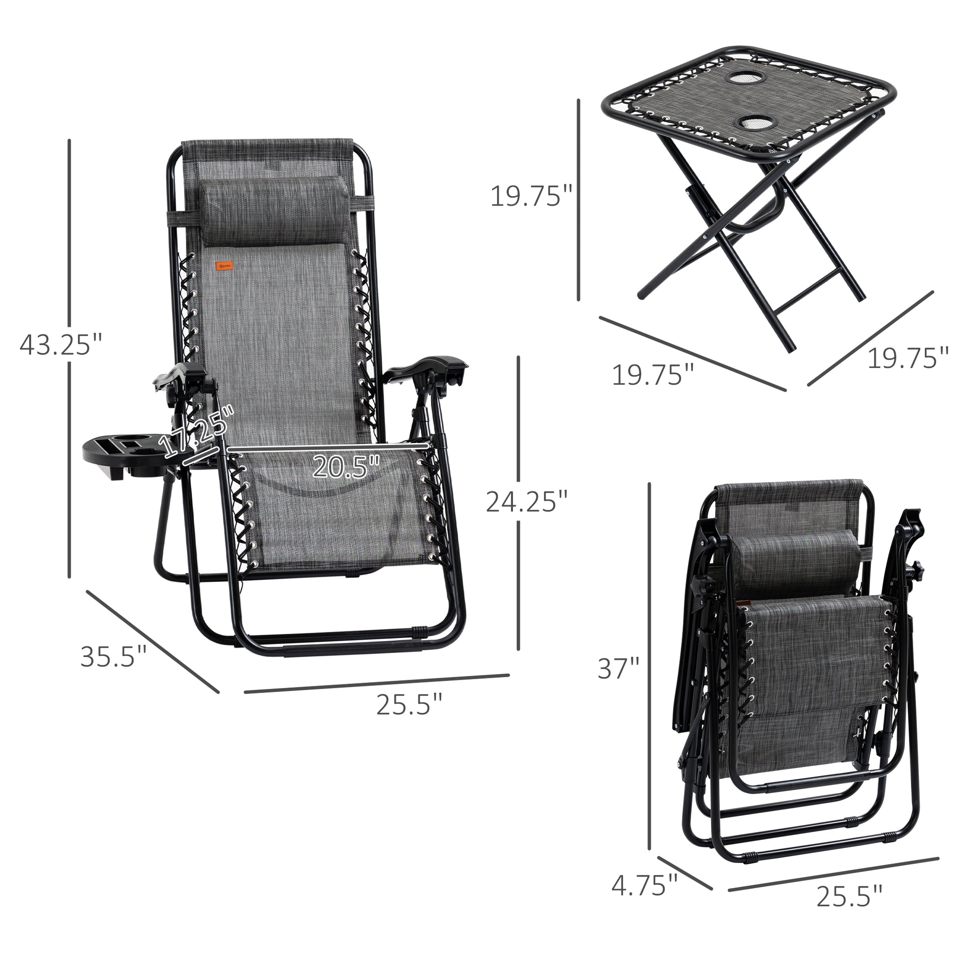 Lounging with a friend has never been so relaxing, thanks to this three-piece garden table and chair set from Outsunny. Two lounge chairs that take the weight off your body, relieving your pressure. Made from strong steel with a powder coat, they feature soft pillows and a breathable mesh fabric to ensure a comfortable sit. The set comes with a matching table, with two built-in cup holders, meaning you won't have to move once sat down. It's perfect for when you want to unwind for hours on end. Features: - Folding reclining zero-gravity chair set - Form-fitting bungee suspension - Includes a folding table with cupholders:- Includes two table trays with a phone slot, magazine space, and cupholders - Pillow headrests - Armrests - Cool and quickly drying breathable mesh seats - Folding powder-coated steel frame is water-safe and lightweight for the road - Assembly required Specification: - Color: Gray - Materials: Steel, Breathable Mesh - Chair Dimensions: 35.5" L x 25.5" W x 43.25" H - Side Table Dimensions: 19.75" W x 19.75" D x 19.75" H - Chair Recline Dimensions: 63" L x 25.25" W x 31" H - Folding Dimensions: 25.5" W x 4.75" T x 34.75" L (Chair), 25.5" L x 19.75" W x 2" H (Table) - Seat Dimensions: 20.5" L x 17.25" W - Seat Height: 17.25" H - Headrest Dimensions: 13.75" L x 6" W x 2" T - Weight Capacity: 264 lbs. (Chair), 88 lbs. (Table) - Item Label: 84B-801GY Package Includes: - 2 x Chai - 1 x Table - 1 x Manual Lounging with a friend has never been so relaxing, thanks to this three-piece garden table and chair set from Outsunny. Features: - Folding reclining zero-gravity chair set - Form-fitting bungee suspension - Includes a folding table with cupholders:- Includes two table trays with a phone slot, magazine space, and cupholders - Pillow headrests - Armrests - Cool and quickly drying breathable mesh seats - Folding powder-coated steel frame is water-safe and lightweight for the road - Assembly required Specification: - Color: Wine Red - Materials: Steel, Breathable Mesh - Chair Dimensions: 35.5" L x 25.5" W x 43.25" H - Side Table Dimensions: 19.75" W x 19.75" D x 19.75" H - Chair Recline Dimensions: 63" L x 25.25" W x 31" H - Folding Dimensions: 25.5" W x 4.75" T x 34.75" L (Chair), 25.5" L x 19.75" W x 2" H (Table) - Seat Dimensions: 20.5" L x 17.25" W - Seat Height: 17.25" H - Headrest Dimensions: 13.75" L x 6" W x 2" T - Weight Capacity: 264 lbs. (Table) - Item Label: 84B-801WR Package Includes: - 2 x Chai - 1 x Table - 1 x Manual Lounging with a friend has never been so relaxing, thanks to this three-piece garden table and chair set from Outsunny. Features: - Folding reclining zero-gravity chair set - Form-fitting bungee suspension - Includes a folding table with cupholders:- Includes two table trays with a phone slot, magazine space, and cupholders - Pillow headrests - Armrests - Cool and quickly drying breathable mesh seats - Folding powder-coated steel frame is water-safe and lightweight for the road - Assembly required Specification: - Color: Brown - Materials: Steel, Breathable Mesh - Chair Dimensions: 35.5" L x 25.5" W x 43.25" H - Side Table Dimensions: 19.75" W x 19.75" D x 19.75" H - Chair Recline Dimensions: 63" L x 25.25" W x 31" H - Folding Dimensions: 25.5" W x 4.75" T x 34.75" L (Chair), 25.5" L x 19.75" W x 2" H (Table) - Seat Dimensions: 20.5" L x 17.25" W - Seat Height: 17.25" H - Headrest Dimensions: 13.75" L x 6" W x 2" T - Weight Capacity: 264 lbs. (Table) - Item Label: 84B-801BN Package Includes: - 2 x Chai - 1 x Table - 1 x Manual Lounging with a friend has never been so relaxing, thanks to this three-piece garden table and chair set from Outsunny. Features: - Folding reclining zero-gravity chair set - Form-fitting bungee suspension - Includes a folding table with cupholders:- Includes two table trays with a phone slot, magazine space, and cupholders - Pillow headrests - Armrests - Cool and quickly drying breathable mesh seats - Folding powder-coated steel frame is water-safe and lightweight for the road - Assembly required Specification: - Color: Blue - Materials: Steel, Breathable Mesh - Chair Dimensions: 35.5" L x 25.5" W x 43.25" H - Side Table Dimensions: 19.75" W x 19.75" D x 19.75" H - Chair Recline Dimensions: 63" L x 25.25" W x 31" H - Folding Dimensions: 25.5" W x 4.75" T x 34.75" L (Chair), 25.5" L x 19.75" W x 2" H (Table) - Seat Dimensions: 20.5" L x 17.25" W - Seat Height: 17.25" H - Headrest Dimensions: 13.75" L x 6" W x 2" T - Weight Capacity: 264 lbs. (Table) - Item Label: 84B-801BU Package Includes: - 2 x Chair - 1 x Table - 1 x Manual.